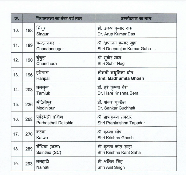 इसके अलावा, पार्टी ने चूंचुड़ा (सीट 190) से सुबीर नाग, हरिपाल (सीट 196) से मधुमिता घोष, तमलुक (सीट 203) से डॉ. हरे कृष्णा बेरा, मेदिनीपुर (सीट 236) से डॉ. शंकर गुच्छैत, पूर्वस्थली दक्षिण (सीट 268) से प्राणकृष्ण तपदार, कटवा (सीट 270) से कृष्णा घोष, सैंथिया (सीट 289) से कृष्णा कांत साहा और नलहाटी (सीट 293) से अनिल सिंह को चुनावी मैदान में उतारा है।
