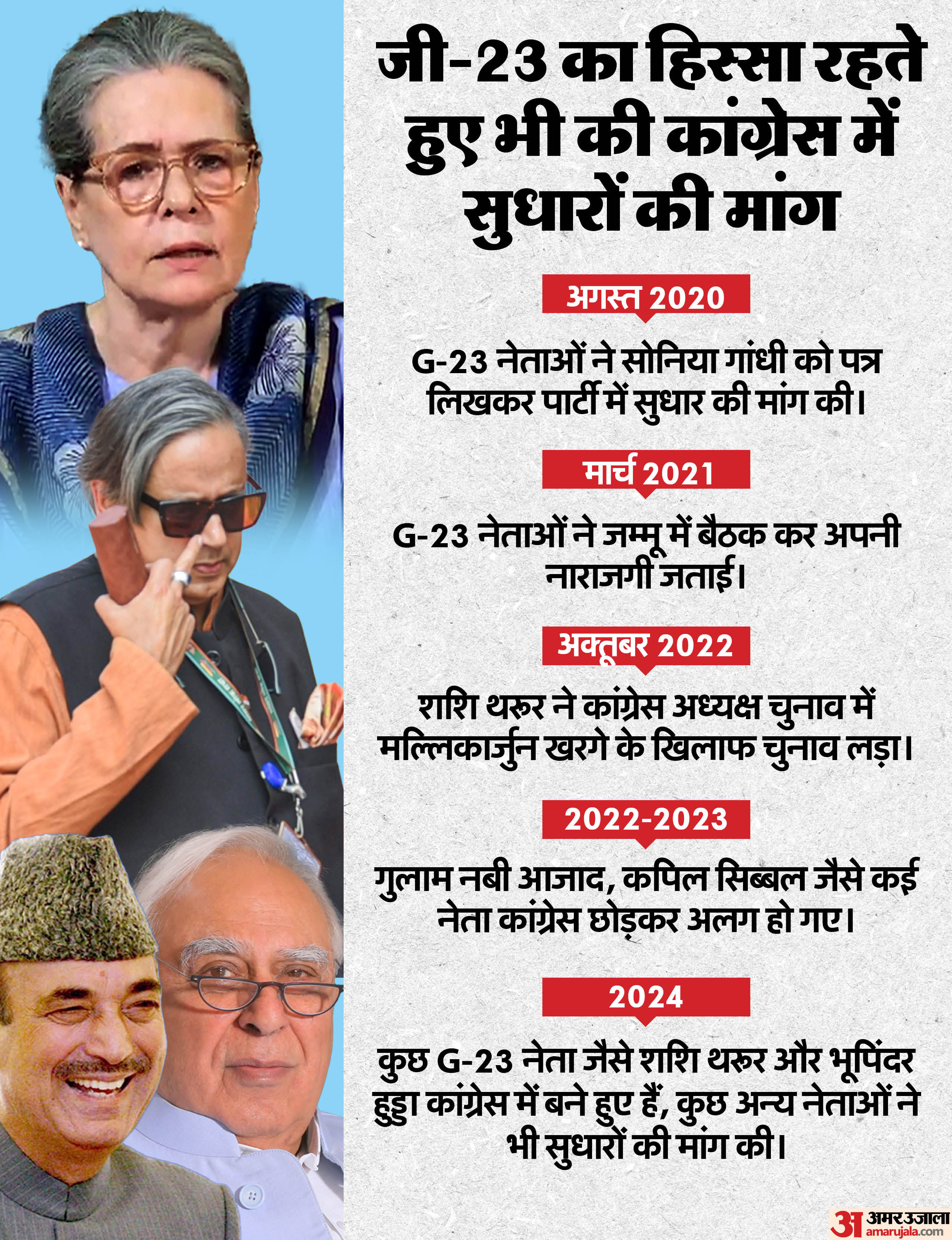 शशि थरूर कांग्रेस के उन वरिष्ठ नेताओं में भी शामिल रहे थे, जिन्होंने अगस्त 2020 कांग्रेस अध्यक्ष सोनिया गांधी को चिट्ठी लिखकर पार्टी में ढाचांगत बदलाव की मांग की थी। 23 सदस्यों वाले इस समूह को तब जी-23 नाम दिया गया था। इसने कांग्रेस में आंतरिक चुनाव, साझा नेतृत्व और संगठन में ज्यादा पारदर्शिता की मांग की थी।