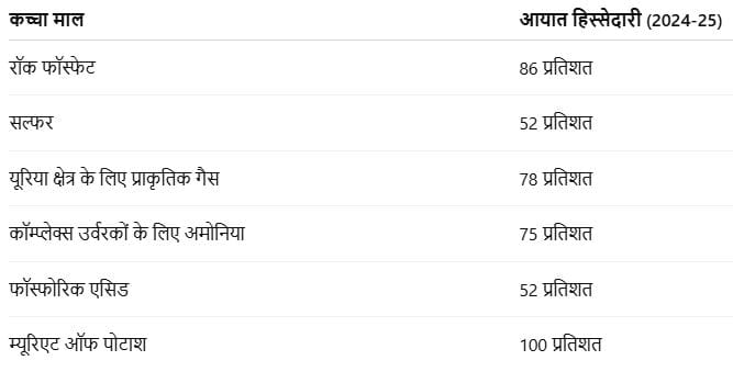 घरेलू भंडार सीमित होने के कारण भारत प्रमुख उर्वरक कच्चे माल और मध्यवर्ती उत्पादों के लिए महत्वपूर्ण रूप से आयात पर निर्भर है।