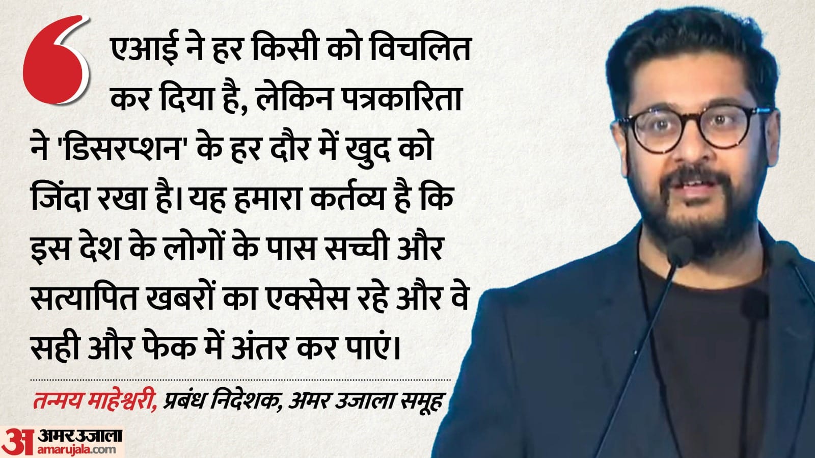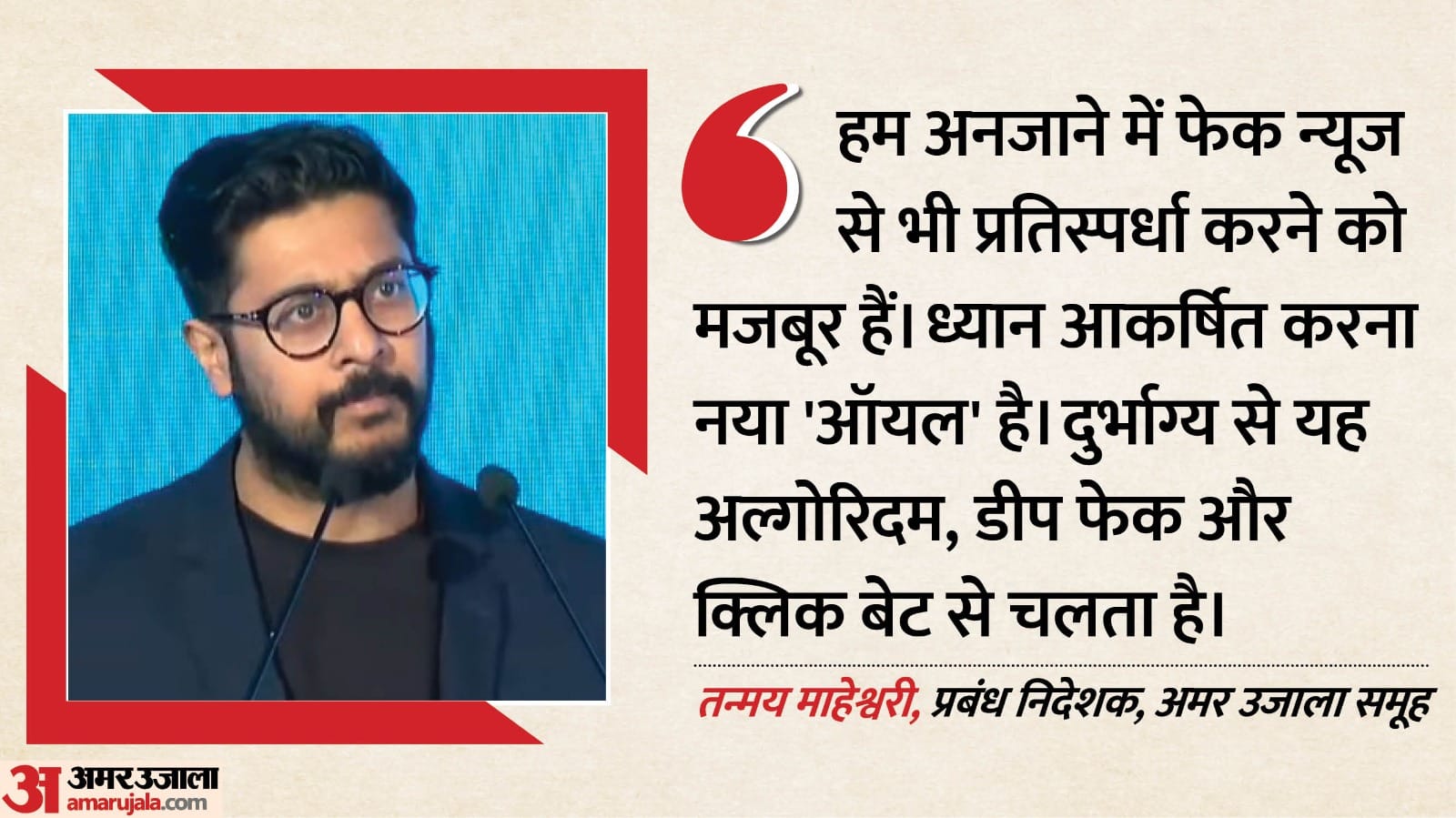 तन्मय माहेश्वरी ने कहा, 'हम सिर्फ डिजिटल बन चुके देश नहीं हैं, हमारे यहां डिजिटल पर अति सक्रिय समाज है। यह भी विडंबना ही है कि हम अब तक का सबसे ज्यादा डिजिटल कंटेंट बना रहे हैं, अब तक का सबसे ज्यादा डिजिटल कंटेंट देख रहे हैं, फिर भी मीडिया का इकोसिस्टम पहले से कहीं ज्यादा संवेदनशील हो गया है। तो क्या भविष्य सिर्फ डिजिटल का होगा या यह देश डिजिटल के साथ विश्वसनीय भविष्य का भी हकदार है? एआई कोई बात आपको संक्षेप में बता सकता है। अनुवाद कर सकता है। शीर्षक भी बना सकता है, लेकिन मेरे विचार से एआई 45 डिग्री तापमान में स्थानीय जरूरतों को समझते हुए ग्राम पंचायत सभा में हिस्सा नहीं ले सकता।'