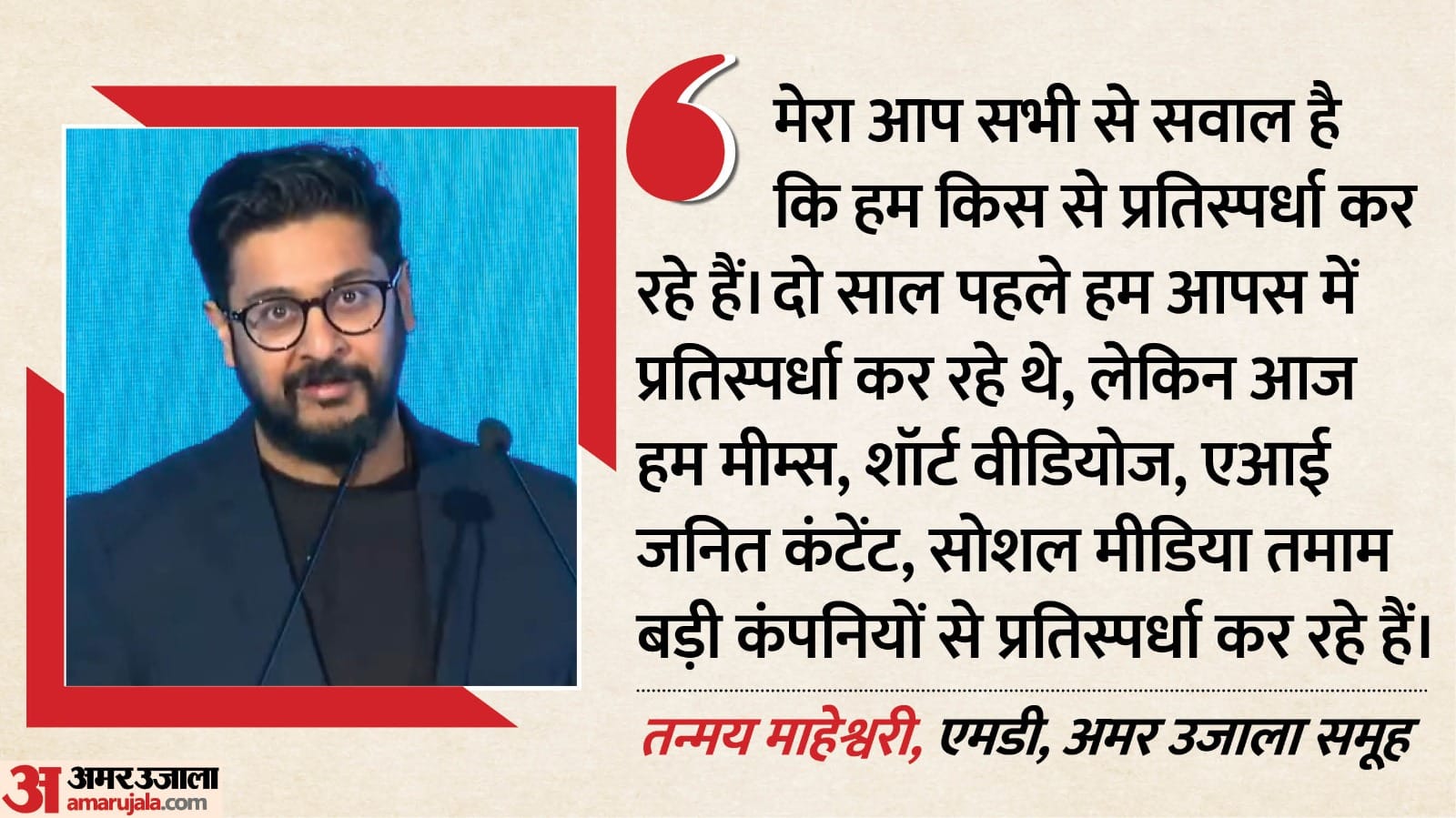 अमर उजाला के एमडी ने कहा, 'प्रतिस्पर्धा आदि से अलग, हमें फेक न्यूज से भी निपटना पड़ रहा है। 80 करोड़ प्लस इंटरनेट यूजर्स, सस्ता डेटा ऐसी चीजें हैं, जिसके चलते पूरी दुनिया की हम पर नजर है। लेकिन दुख की बात ये है कि हम बहुत ज्यादा कंटेंट क्रिएट कर रहे हैं और बहुत ज्यादा कंटेंट देख रहे हैं। जिसके चलते मीडिया कंटेंट डोमेन नाजुक स्थिति में है। हमारा देश डिजिटल, विश्वसनीय भविष्य का हकदार है। एआई आज सब कुछ कर सकता है, वह ट्रांसलेट कर सकता है, खबर लिख सकता है। लेकिन एआई पंचायत बैठक में शामिल नहीं हो सकता और स्थानीय लोगों को नहीं समझ सकता और फिर उनकी स्थिति को देश के साथ साझा नहीं कर सकता।'