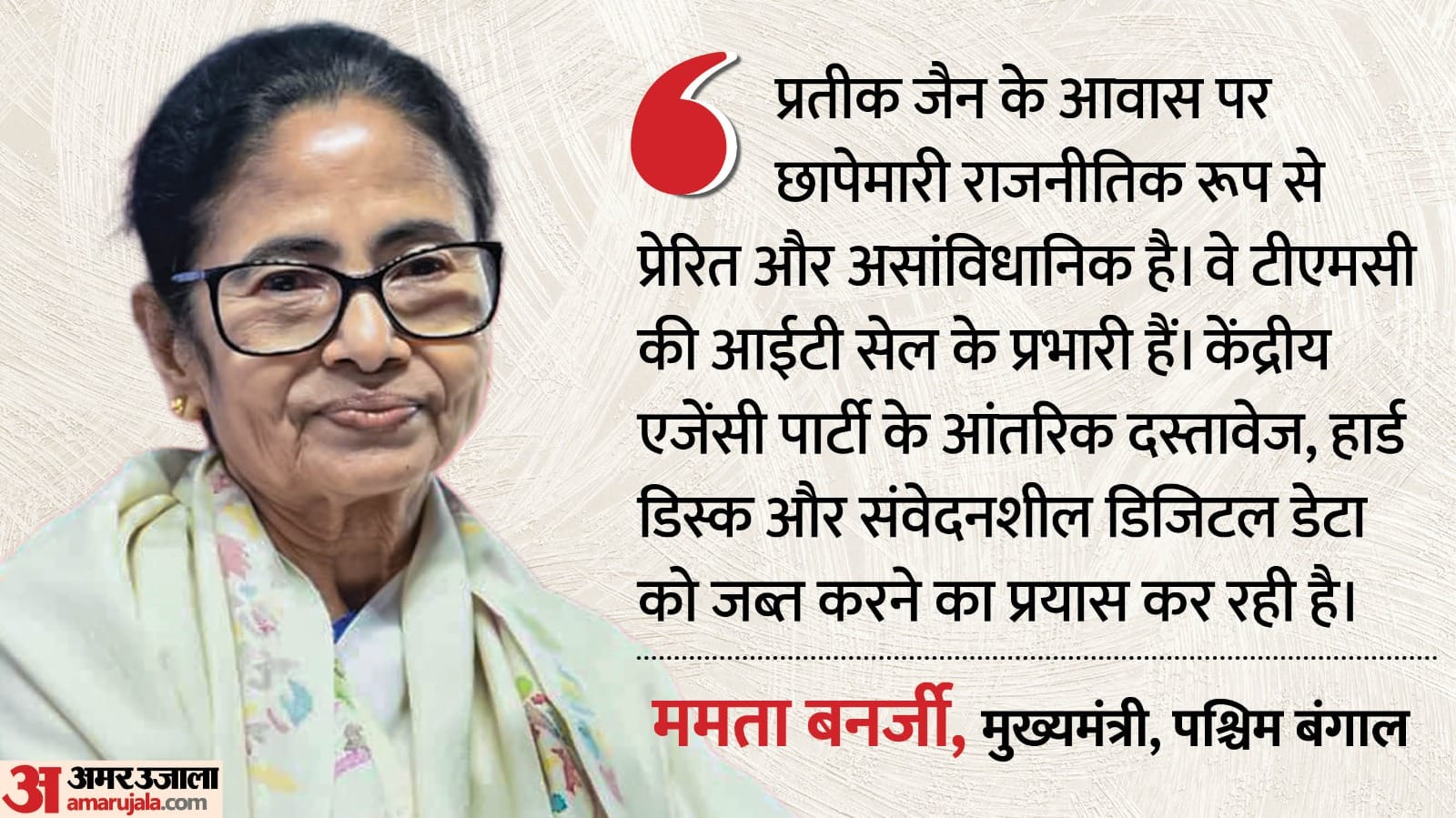 पश्चिम बंगाल की मुख्यमंत्री ममता बनर्जी ने गुरुवार को आरोप लगाया कि ईडी के अधिकारी आईपीएसी प्रमुख प्रतीक जैन के आवास पर तलाशी अभियान के दौरान टीएमसी की हार्ड डिस्क, आंतरिक दस्तावेज और संवेदनशील संगठनात्मक डेटा जब्त करने का कोशिश कर रहे थे। बंगाल की मुख्यमंत्री ममता बनर्जी ने आरोप लगाते हुए कहा कि टीएमसी के आईटी प्रमुख के घर पर ईडी की छापेमारी राजनीतिक बदले की भावना से प्रेरित और असांविधानिक है, यह गृह मंत्री का सबसे घिनौना काम है।