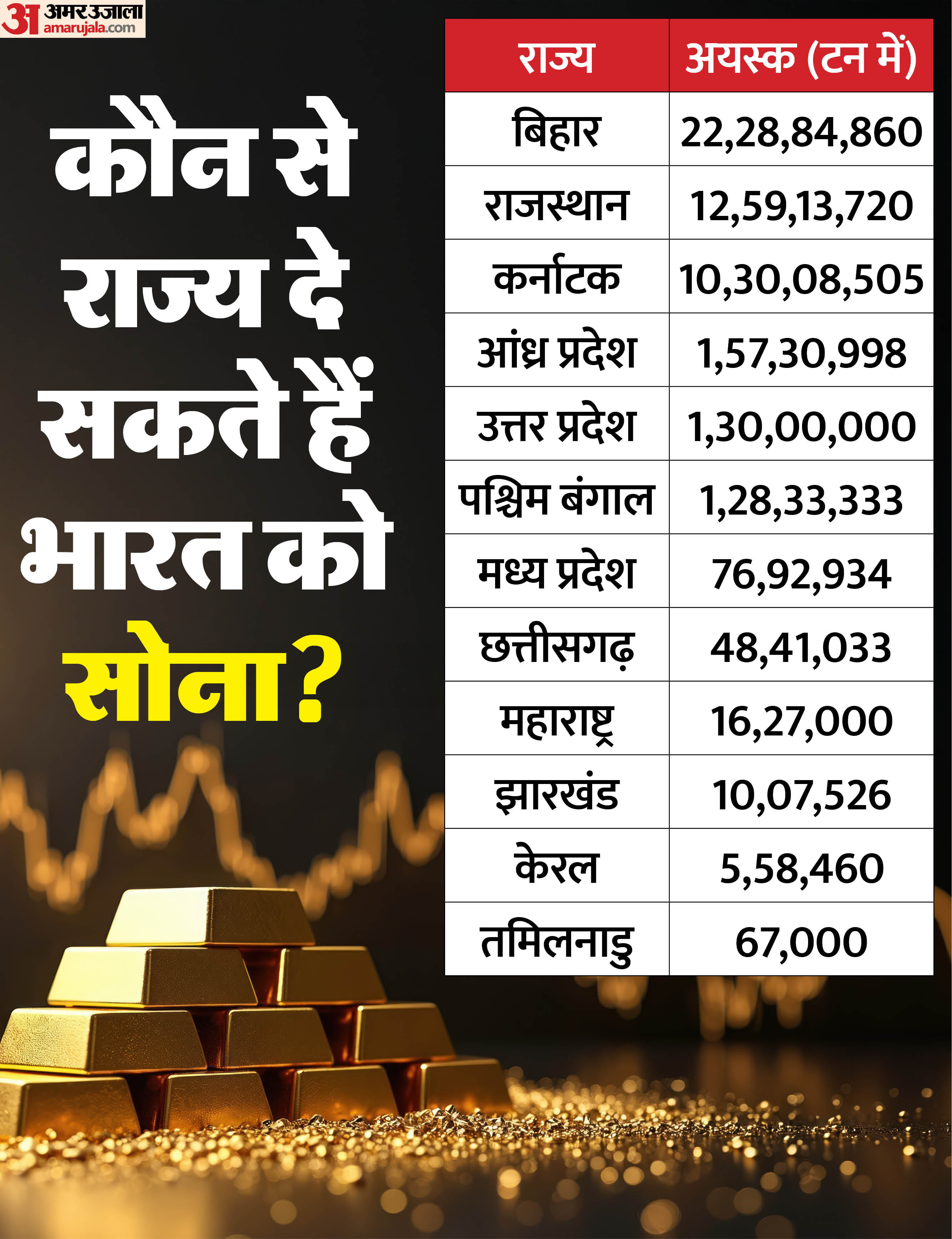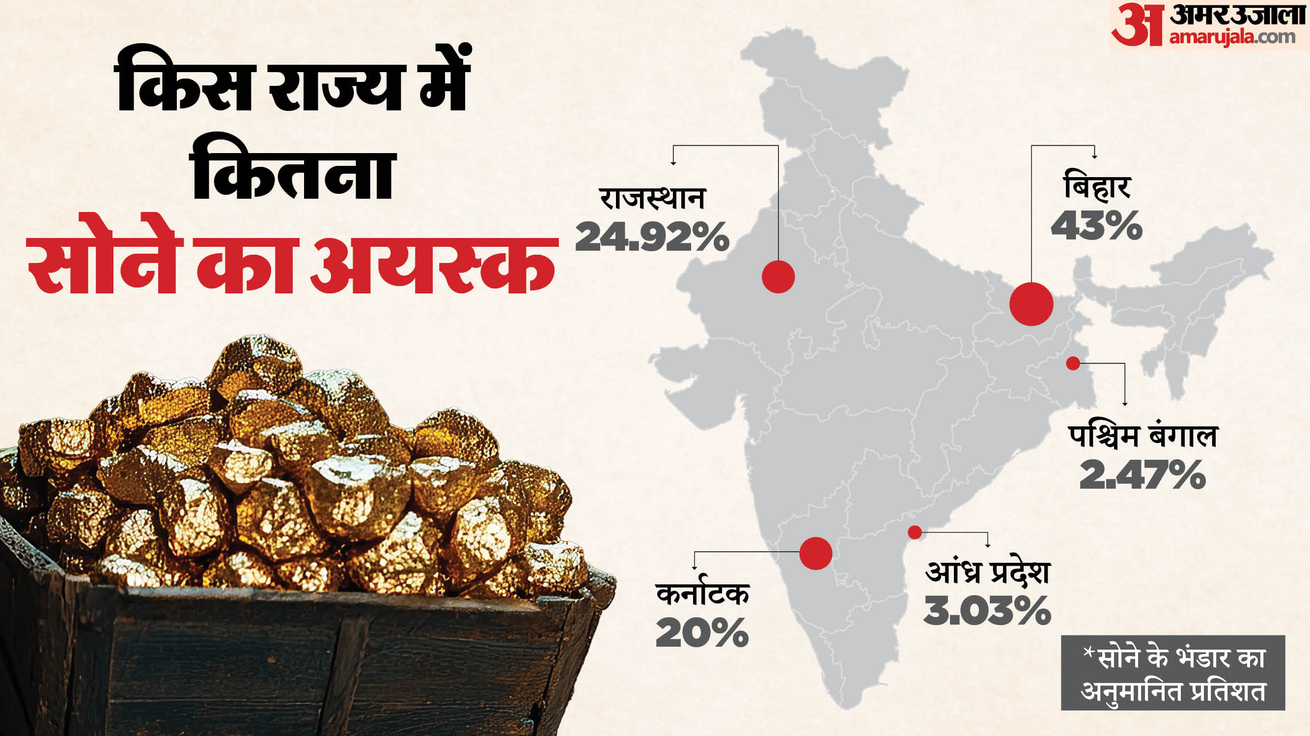 शीर्ष राज्य: संसाधनों की उपलब्धता के मामले में बिहार शीर्ष पर है, उसके बाद राजस्थान, कर्नाटक, पश्चिम बंगाल और आंध्र प्रदेश आते हैं। बिहार में संसाधन अधिक हैं, लेकिन इनमें से अधिकतर सर्वे पर आधारित हैं। इन जगहों पर सोने की मौजूदगी को लेकर अनुसंधान जारी हैं।