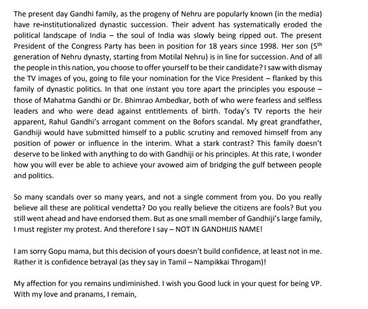 विपक्ष के उप-राष्ट्रपति उम्मीदवार गोपालकृष्ण गांधी के भतीजे श्रीकृष्ण कुलकर्णी उर्फ कृष ने उनके नामांकन के विरोध में एक पत्र लिखा है। पत्र में उन्होंने कांग्रेस की नीतियों पर भी सवाल खड़ा किया है। उन्होंने अपने पत्र में लिखा कि नेहरू-गांधी परिवार ने एक बार फिर पीढ़ी दर पीढ़ी सत्ता में बने रहने का सिलसिला शुरू कर दिया है।