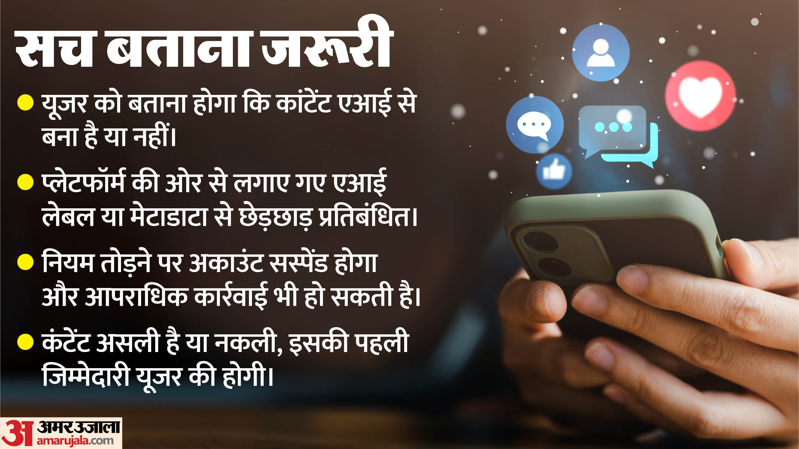 अनिवार्य घोषणा (यूजर डिक्लेरेशन): सोशल मीडिया प्लेटफॉर्म्स के लिए अब यह जरूरी है कि वे यूजर्स से यह घोषणा लें कि उनके द्वारा अपलोड की गई सामग्री एआई से तैयार की गई है या नहीं। जब यूजर किसी बड़े प्लेटफॉर्म पर कंटेंट अपलोड करेंगे, तो इसकी खुद घोषणा करनी होगी कि क्या इसे बनाने में एआई का उपयोग किया गया है।