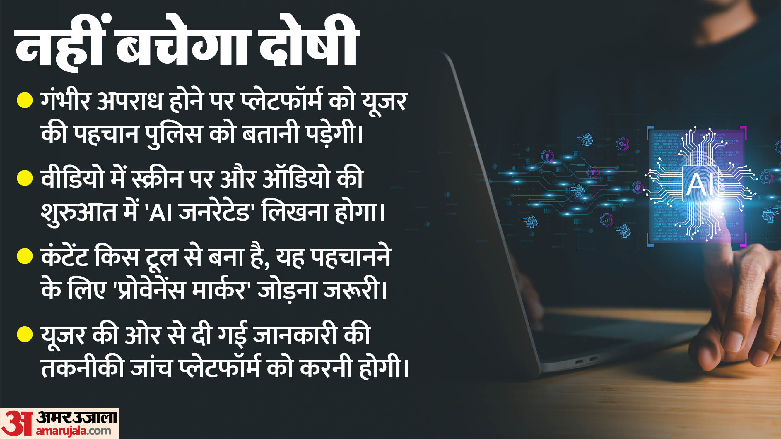 स्पष्ट लेबलिंग: सिंथेटिक सामग्री बनाने या प्रसारित करने वाले प्लेटफॉर्म्स के लिए अब इसे प्रमुखता से लेबल करना जरूरी है। वीडियो में स्क्रीन पर स्पष्ट लेबल और ऑडियो में शुरुआत में डिस्क्लोजर देना होगा।