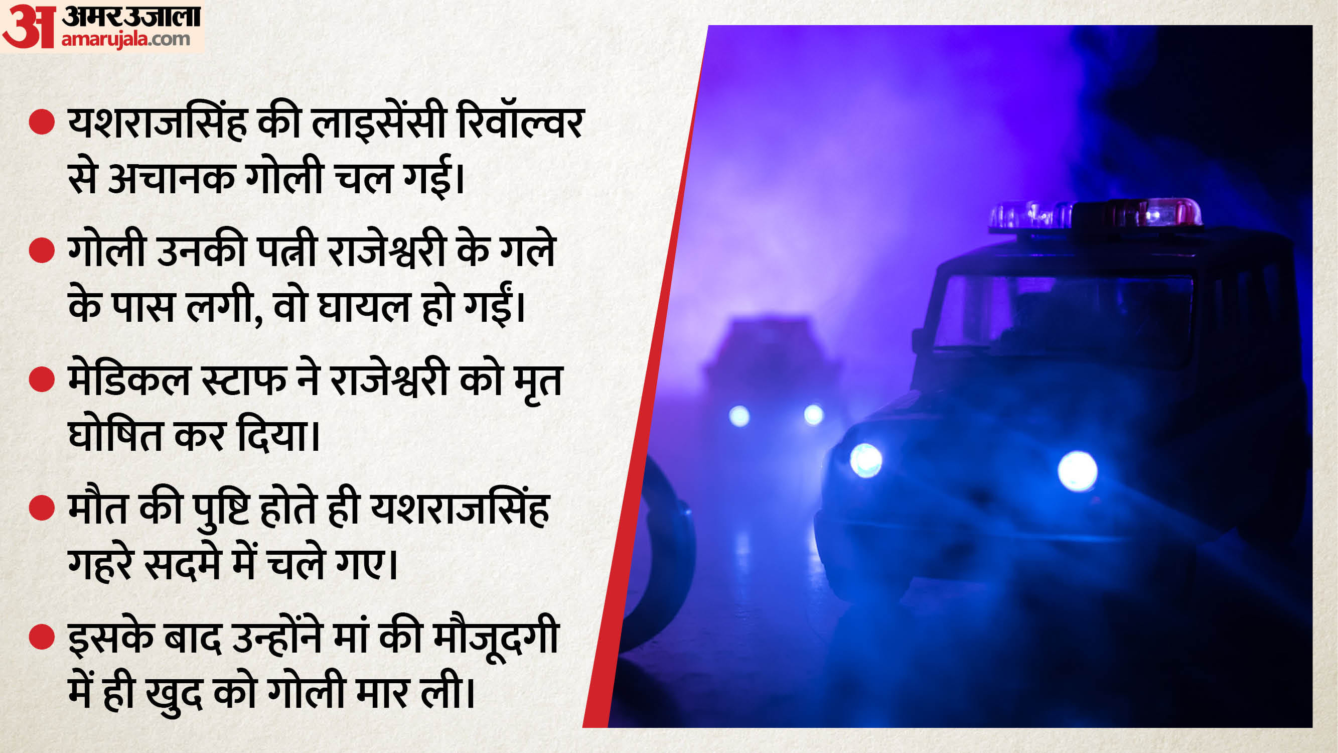 पुलिस के अनुसार यशराजसिंह गोहिल अपनी लाइसेंसी रिवॉल्वर की जांच कर रहे थे। इसी दौरान अचानक गोली चल गई। गोली उनकी पत्नी राजेश्वरी के गले के पास लगी। परिजन तुरंत 108 एंबुलेंस सेवा को बुलाया। मौके पर पहुंचे पैरामेडिकल स्टाफ ने राजेश्वरी को मृत घोषित कर दिया। पत्नी की मौत की खबर सुनते ही यशराजसिंह गहरे सदमे में चले गए।