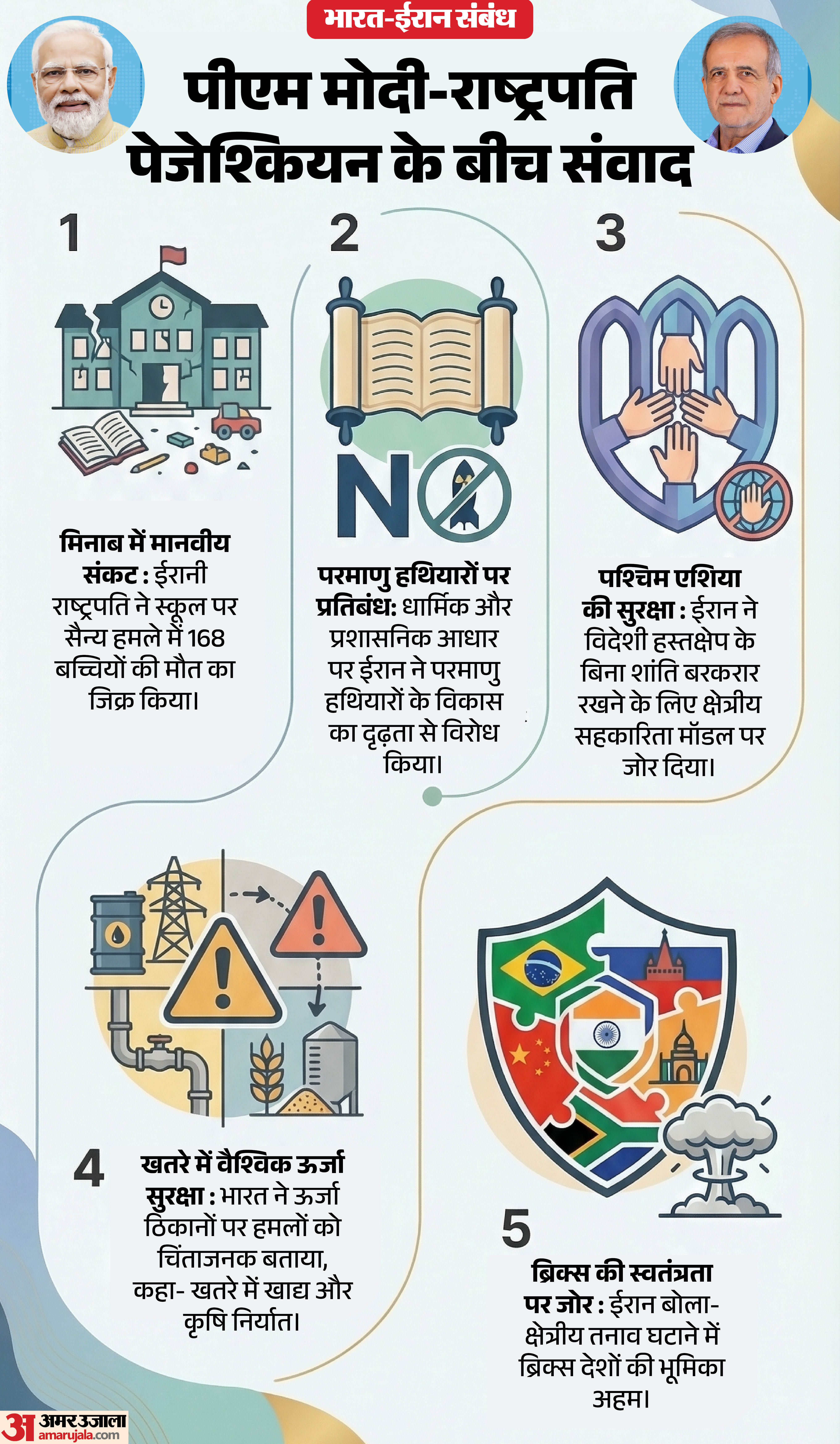 भारत में ईरान के दूतावास ने सोशल मीडिया पोस्ट में कहा कि राष्ट्रपति मसूद पेजेश्कियन ने पीएम मोदी के साथ बातचीत में ब्रिक्स से ईरान के खिलाफ अमेरिका-इस्राइल की आक्रामकता को रोकने में एक स्वतंत्र भूमिका निभाने का आह्वान किया। भारत इस समय ब्रिक्स का अध्यक्ष है। ईरानी राष्ट्रपति ने यह भी कहा कि युद्ध और व्यापक संघर्ष को समाप्त करने के लिए अमेरिका और इस्राइल की ओर से हमले को तत्काल रोकने की आवश्यकता है। उन्होंने कहा कि यह गारंटी भी होनी चाहिए कि भविष्य में अमेरिका और इस्राइल की तरफ से ईरान पर हमले नहीं किए जाएंगे। ईरानी राष्ट्रपति ने विदेशी हस्तक्षेप के बिना शांति सुनिश्चित करने के लिए पश्चिम एशियाई देशों को शामिल करते हुए एक क्षेत्रीय सुरक्षा ढांचे का प्रस्ताव किया।