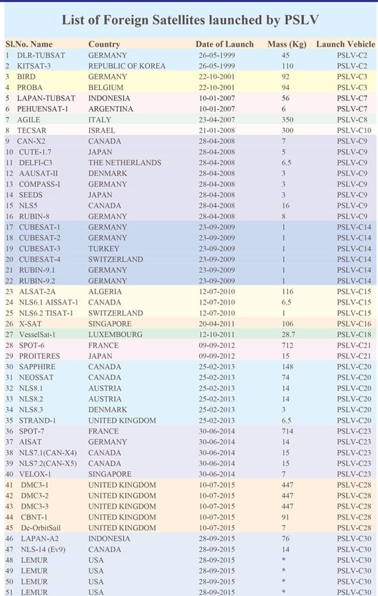 15 फरवरी 2017 को इसरो ने एक साथ सबसे ज्यादा सैटेलाइट्स लॉन्च करने का वर्ल्ड रिकॉर्ड बनाया था। 30 मिनट में एक रॉकेट के जरिए 7 देशों के 104 सैटेलाइट्स एक साथ लॉन्च किए थे। इससे पहले यह रिकॉर्ड रूस के नाम था। उसने 2014 में एक बार में 37 सैटेलाइट्स लॉन्च किए थे।साल 2015 तक हमने अतंरिक्ष में 51 विदेशी सैटेलाइट्स को लांच किया है। जिनकी सूची इस प्रकार है: