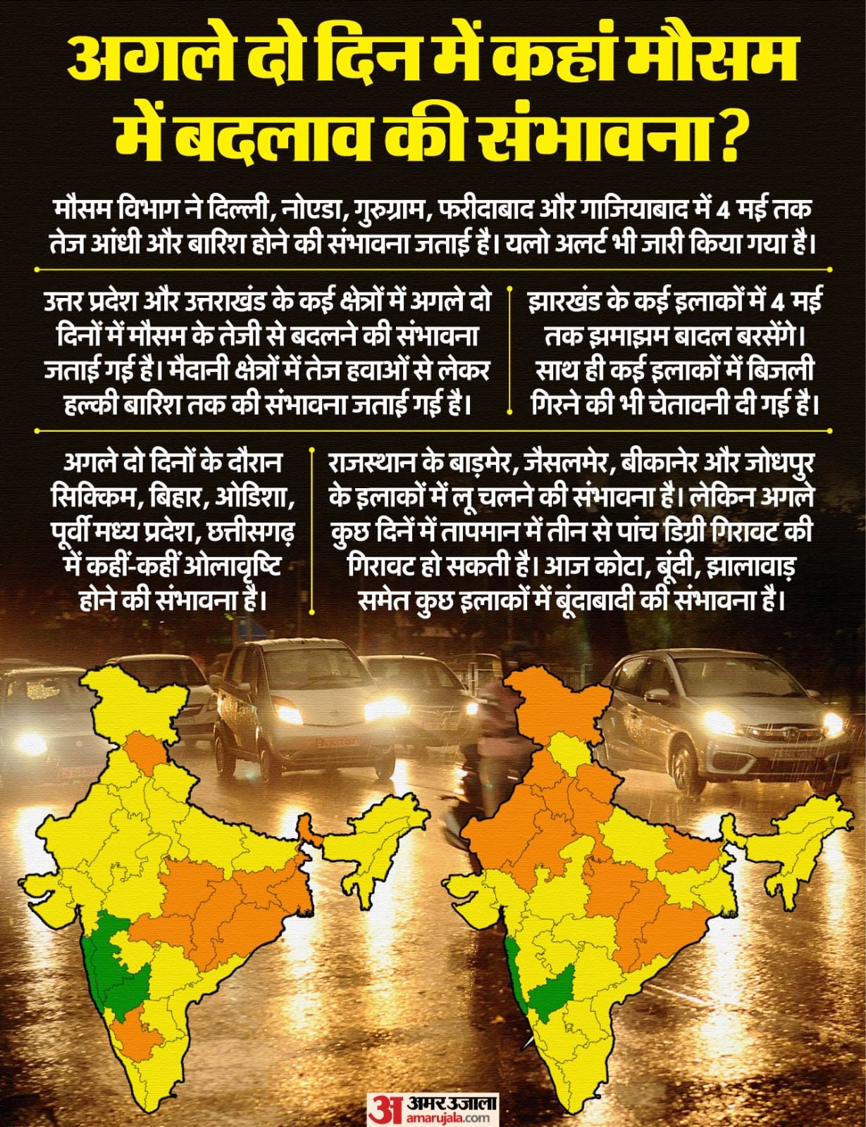 - इसके अलावा पंजाब, हरियाणा, चंडीगढ़, दिल्ली और राजस्थान में 5 मई तक धूल भरी आंधी चलने की संभावना है। इनमें से कुछ क्षेत्रों में हल्की से मध्यम बारिश का अनुमान है।