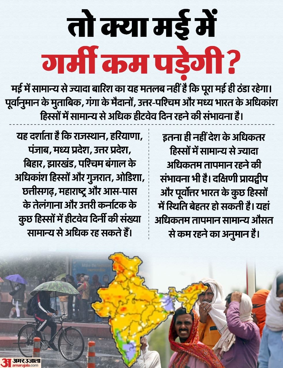 मौसम विभाग के मुताबिक, शुरुआती दिनों में गरज के साथ बारिश के चलते अलग-अलग राज्यों में तापमान गिरेगा। मई में पूरे देश में औसत वर्षा सामान्य से ज्यादा ही रहेगी। लंबी अवधि का यह औसत 109 फीसदी तक हो सकता है।