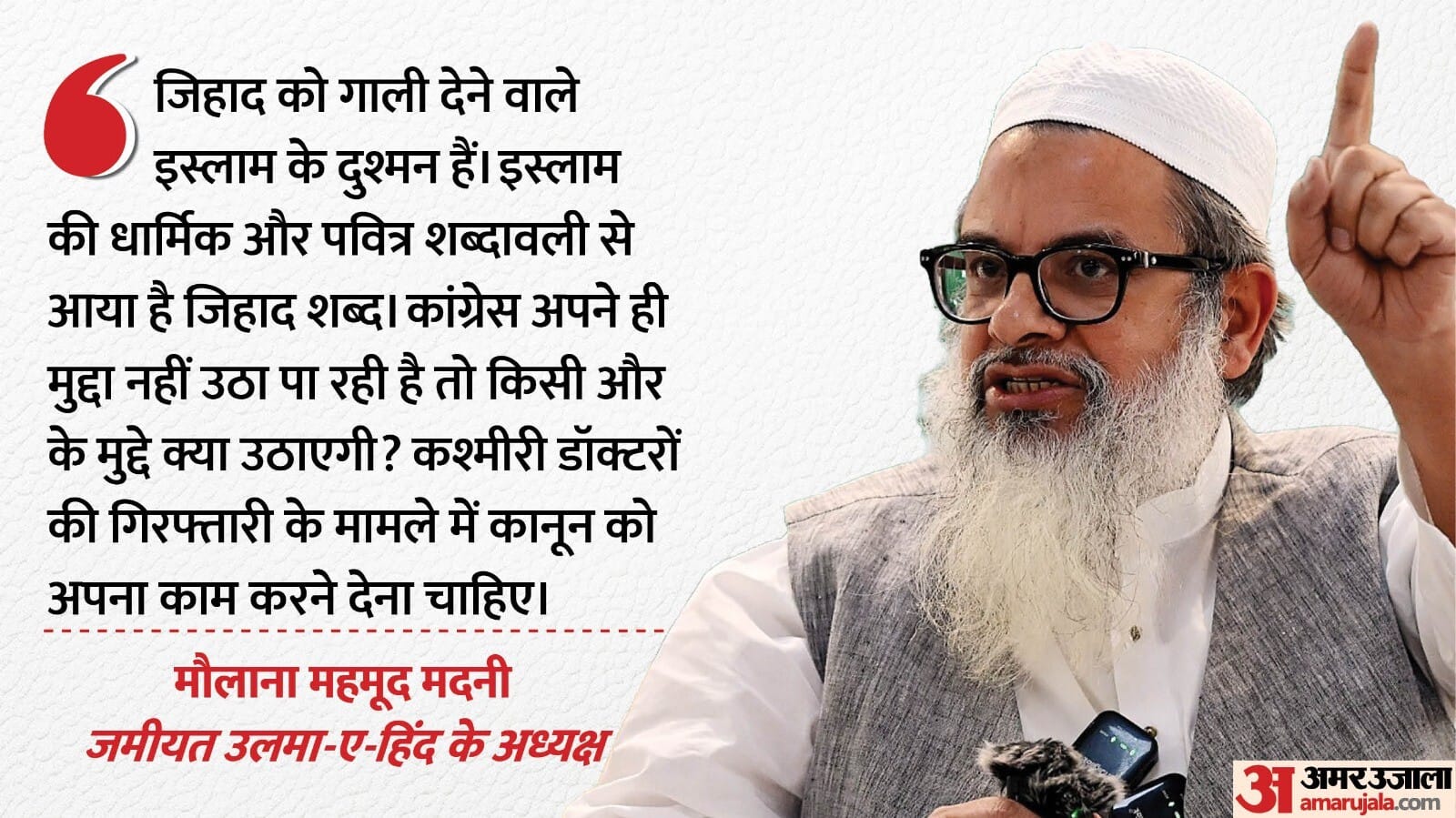 मौलाना महमूद मदनी ने जमीयत उलमा-ए-हिंद की तरफ से एक बार फिर जिहाद, देश की सियासत, स्कूलों के पाठ्यक्रम जैसे ज्वलंत मुद्दों पर बात की। मदनी ने कांग्रेस के जनाधार पर सवाल खड़े करने के अलावा देशभर के स्कूलों के पाठ्यक्रम में जिहाद को पढ़ाने पर भी जोर दिया। मदनी ने कहा कि जो लोग जिहाद का विरोध कर रहे हैं वे गद्दार हैं और आतंकवाद फैलाने का काम कर रहे हैं।