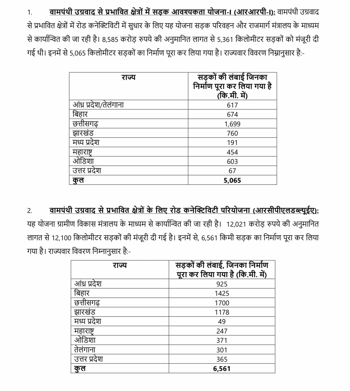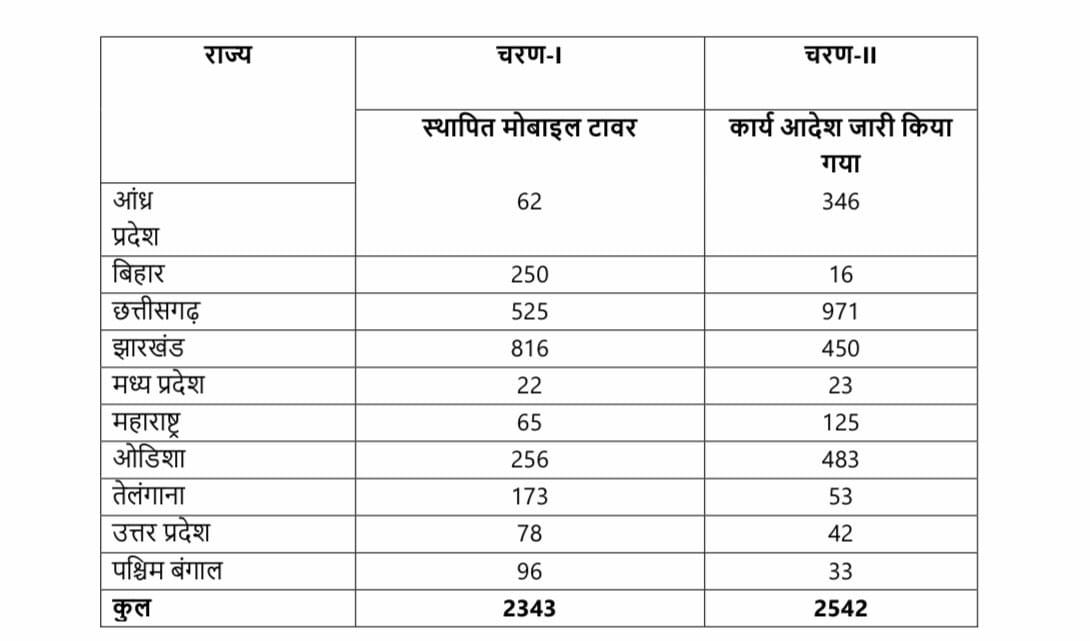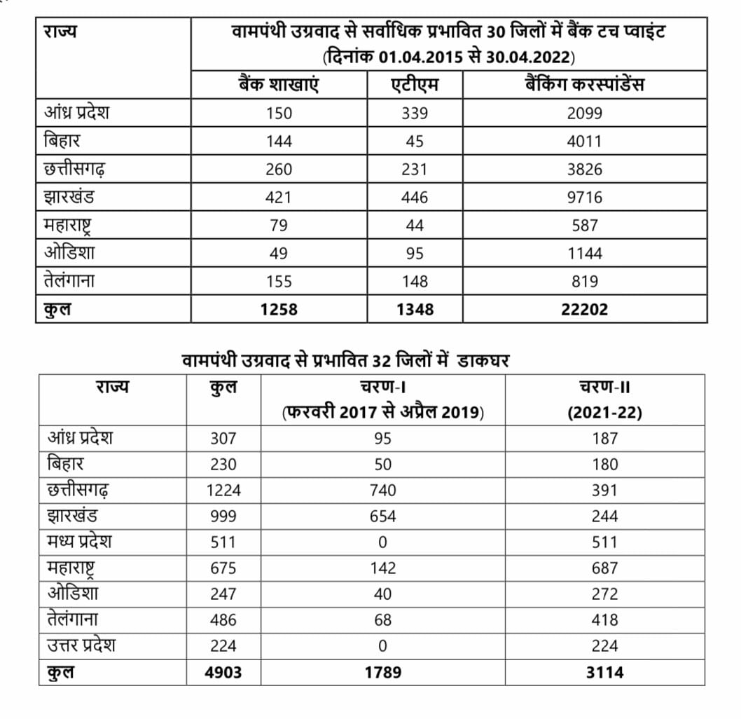 वामपंथी उग्रवाद से प्रभावित क्षेत्रों में जनजातीय कार्य मंत्रालय, एकलव्य मॉडल आवासीय स्कूल 'ईएमआरएस' योजना को संचालित कर रहा है। ऐसे इलाकों में 245 ईएमआरएस में से 103 ईएमआरएस, पिछले तीन वर्षों के दौरान ही स्वीकृत किए गए हैं। इससे पहले 21 वर्ष की अवधि के दौरान 142 ईएमआरएस स्वीकृत किए गए थे। अब तक, वामपंथी उग्रवाद से प्रभावित पूर्ववर्ती 90 (जून 2021 तक) जिलों में 245 ईएमआरएस स्वीकृत हुए हैं। ऐसे क्षेत्रों में मोबाइल कनेक्टिविटी परियोजना के प्रथम चरण के तहत 4080.78 करोड़ रुपये की लागत से 2343 मोबाइल टावर स्थापित किए गए थे। अप्रैल 2022 में केंद्रीय मंत्रिमंडल में इन टूजी साइटों को फोर जी में अपग्रेड करने की मंजूरी दी थी। गत नवंबर में अपग्रेडेशन का यह कार्य अवार्ड किया गया है। परियोजना के चरण-2 के अंतर्गत 2542 मोबाइल टावर स्थापित करने के लिए कार्य आदेश भी जारी कर दिया गया है।