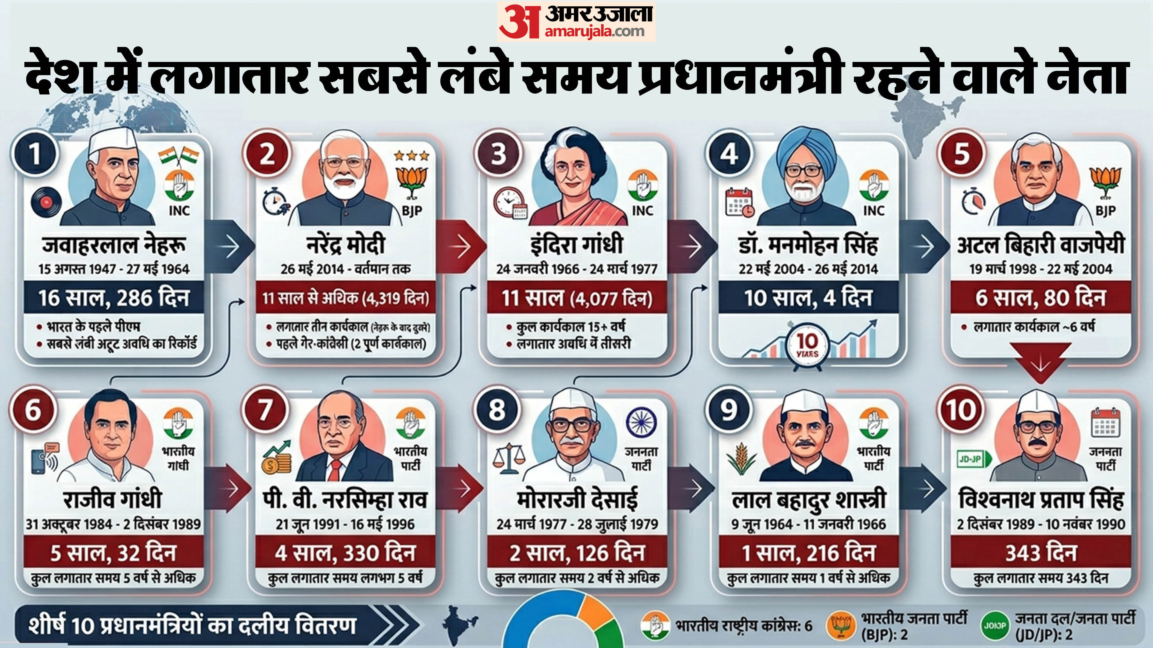 भारत के सबसे लंबे समय तक प्रधानमंत्री रहने का रिकॉर्ड अभी भी जवाहरलाल नेहरू के नाम है, जिन्होंने 16 वर्ष और 286 दिनों तक देश की सेवा की। उनके बाद इंदिरा गांधी का स्थान आता है, जिनका अलग-अलग कार्यकालों को मिलाकर कुल समय 15 वर्ष और 350 दिनों का रहा। यानी पीएम मोदी को इन दोनों ही रिकॉर्ड्स को तोड़ने के लिए चौथे कार्यकाल तक जाना होगा, जो 2029 के बाद ही संभव है। फिलहाल प्रधानमंत्री मोदी इन दोनों नेताओं से पीछे हैं और तीसरे स्थान पर हैं।2. लगातार सबसे लंबे समय तक प्रधानमंत्री