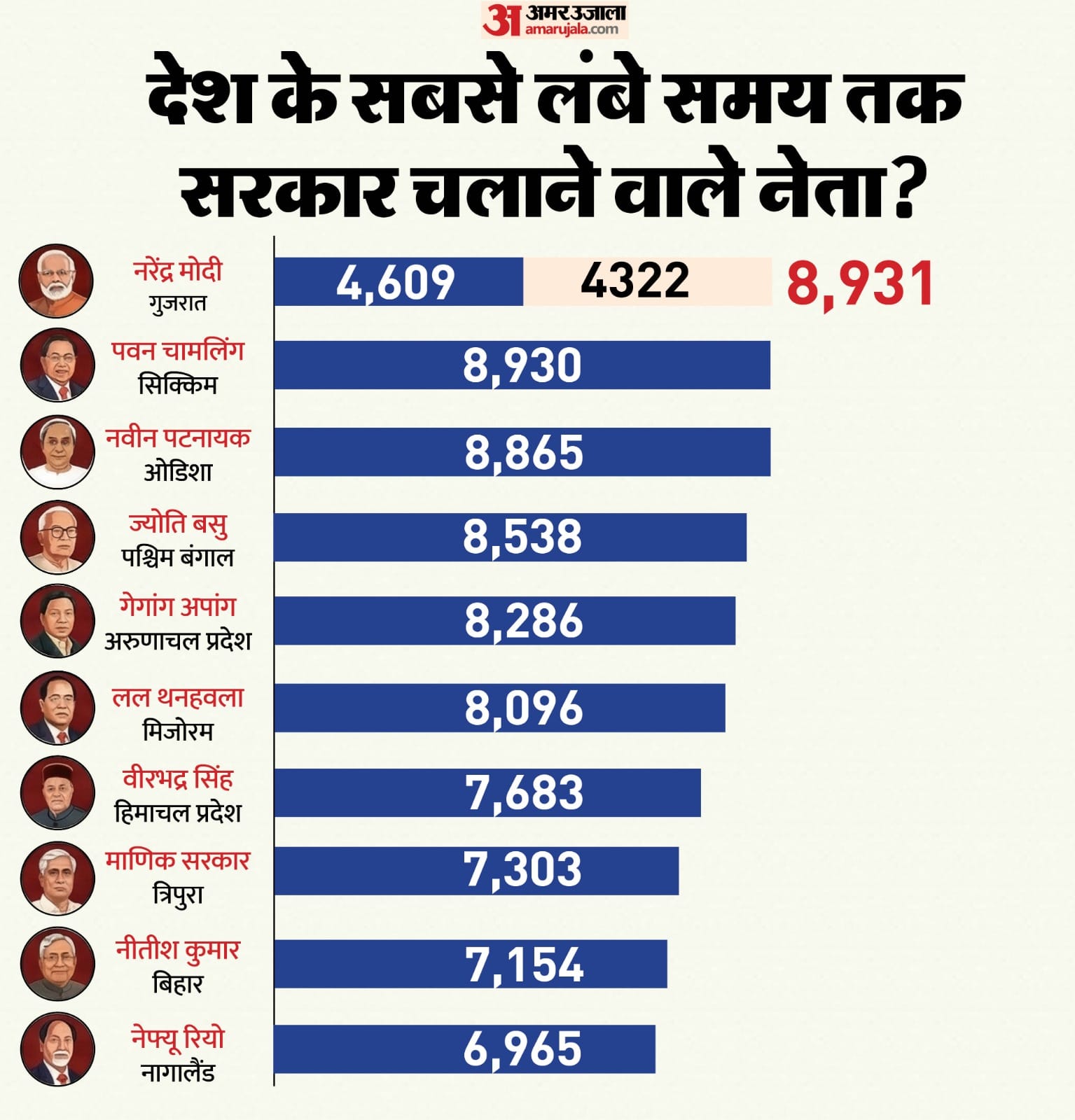 प्रधानमंत्री नरेंद्र मोदी ने एक और ऐतिहासिक उपलब्धि अपने नाम कर ली है। रविवार (22 मार्च 2026) को मोदी कुल मिलाकर 8931 दिन तक अलग-अलग सरकारों के प्रमुख रह चुके हैं। यानी वे अब भारत के सबसे लंबे समय तक सरकार चलाने वाले नेता बन चुके हैं। अपनी इस उपलब्धि के साथ ही उन्होंने पवन कुमार चामलिंग का रिकॉर्ड तोड़ दिया, जो कि 8930 दिन तक सिक्किम में सरकार के प्रमुख रहे थे।