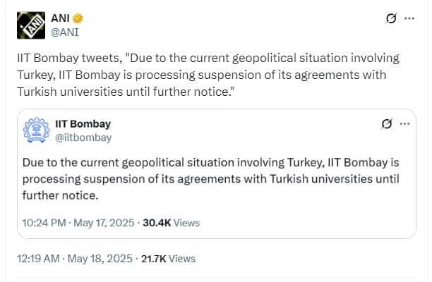 भारतीय प्रौद्योगिकी संस्थान (आईआईटी) बॉम्बे ने तुर्किये से उपजे तनाव के बीच बड़ा फैसला लिया है। संस्थान ने अपने आधिकारिक एक्स हैंडल पर एक पोस्ट में लिखा, 'तुर्किये से जुड़ी वर्तमान भू-राजनीतिक स्थिति के कारण, आईआईटी बॉम्बे अगली सूचना तक तुर्किये के विश्वविद्यालयों के साथ अपने समझौतों को निलंबित करने पर विचार कर रहा है।'