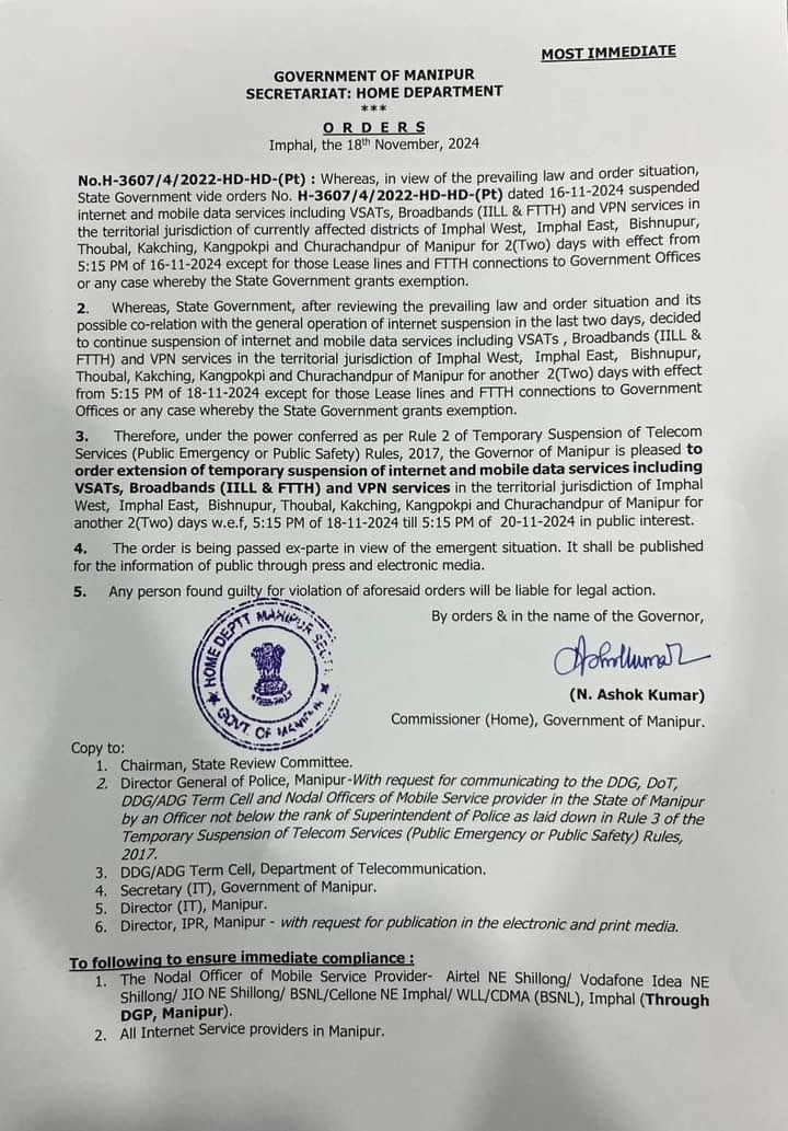 हिंसाग्रस्त मणिपुर में अशांति के बीच राज्य के सात प्रभावित जिलों में इंटरनेट प्रतिबंध दो दिनों के लिए बढ़ा दिया गया है।