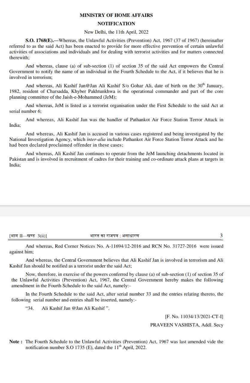 गृह मंत्रालय ने अली काशिफ जान से संबंधित नोटिफिकेशन भी जारी किया है। इस नोटिफिकेशन में लिखा है कि गैर-कानूनी गतिविधियां (रोकथाम) अधिनियम के तहत अली काशिफ जान को आतंकवादी घोषित किया गया है, जो पठानकोट एयरफोर्स स्टेशन आतंकी हमले में शामिल था।