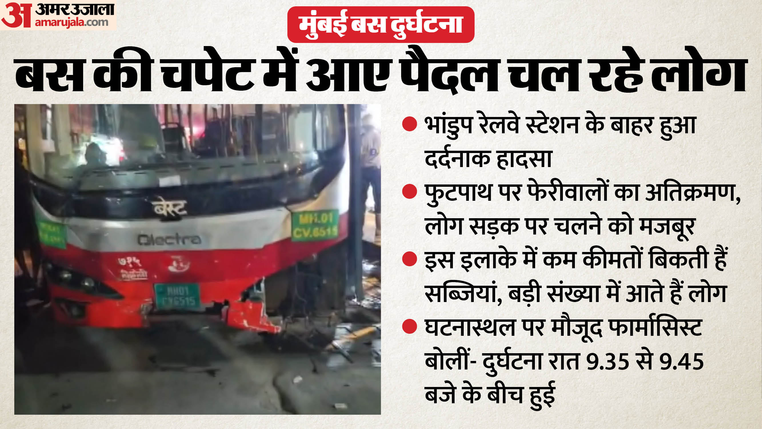 मुंबई बस हादसे को लेकर चश्मदीदों ने बताया कि फुटपाथ पर हॉकर्स (फेरीवाले) के कब्जे के चलते पैदल चलने वालों को सड़क पर उतरना पड़ा, जिससे हादसा हुआ और इसमें चार लोगों की मौत हो गई। सोमवार रात मुंबई के भांडुप इलाके में एक बेस्ट बस की टक्कर से तीन महिलाओं समेत चार लोगों की मौत हो गई और नौ अन्य घायल हो गए।