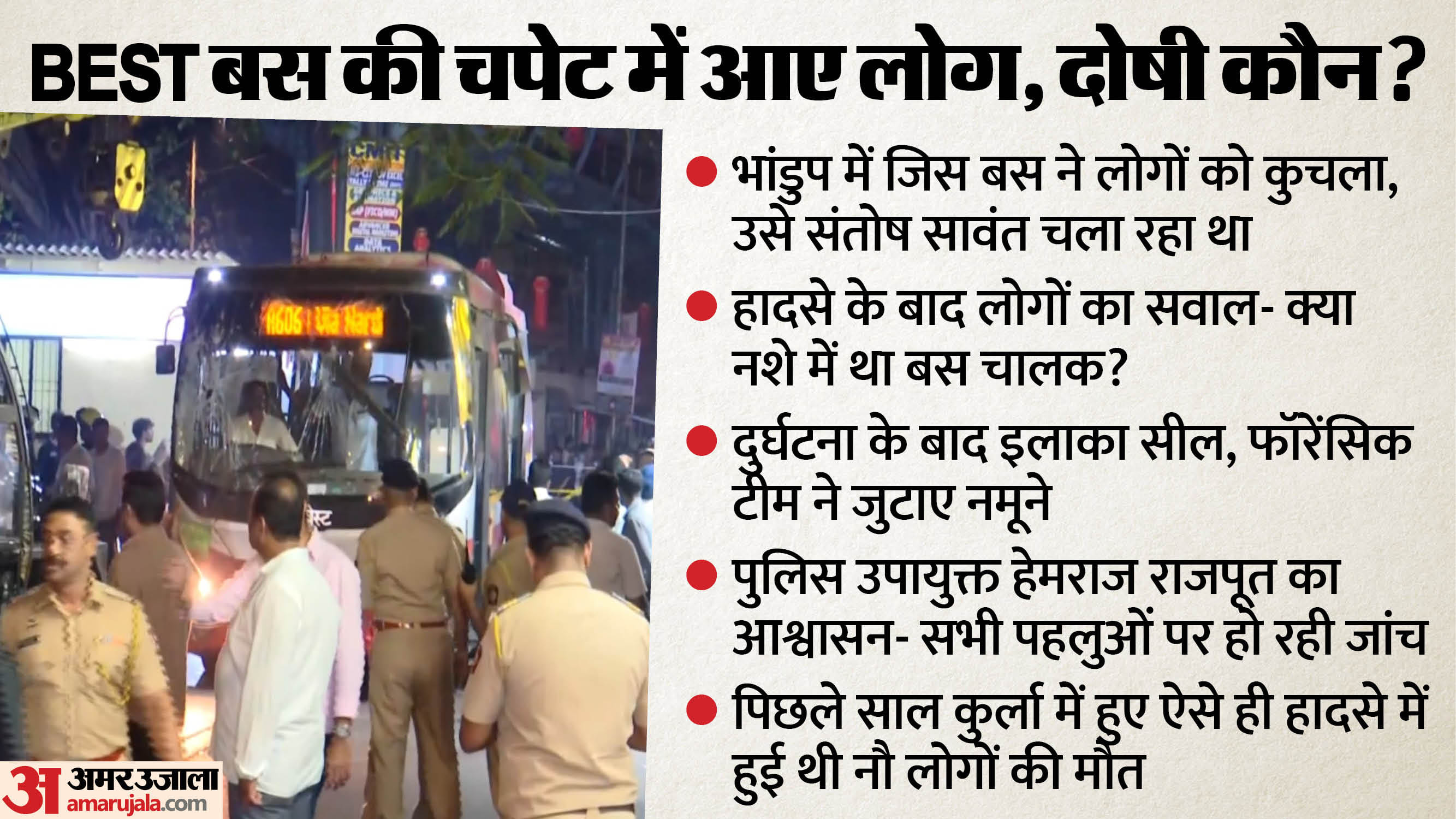 पुलिस उपायुक्त हेमराज राजपूत ने बताया कि मरने वालों में वे पैदल चलने वाले लोग शामिल थे। मुदलियार ने बताया कि यह बेस्ट इलेक्ट्रिक बस से जुड़ा दूसरा ऐसा हादसा है, पिछले साल कुर्ला में भी इसी तरह की घटना हुई थी जिसमें नौ लोगों की मौत हो गई थी। उन्होंने मांग की कि इन घटनाओं की ठीक से जांच की जाए ताकि निर्दोष नागरिकों को इस तरह से जान न गंवानी पड़े। उन्होंने यह भी कहा कि पुलिस को जांच करनी चाहिए कि बस ड्राइवर, जिसकी पहचान बाद में संतोष सावंत के रूप में हुई, नशे में था या नहीं।