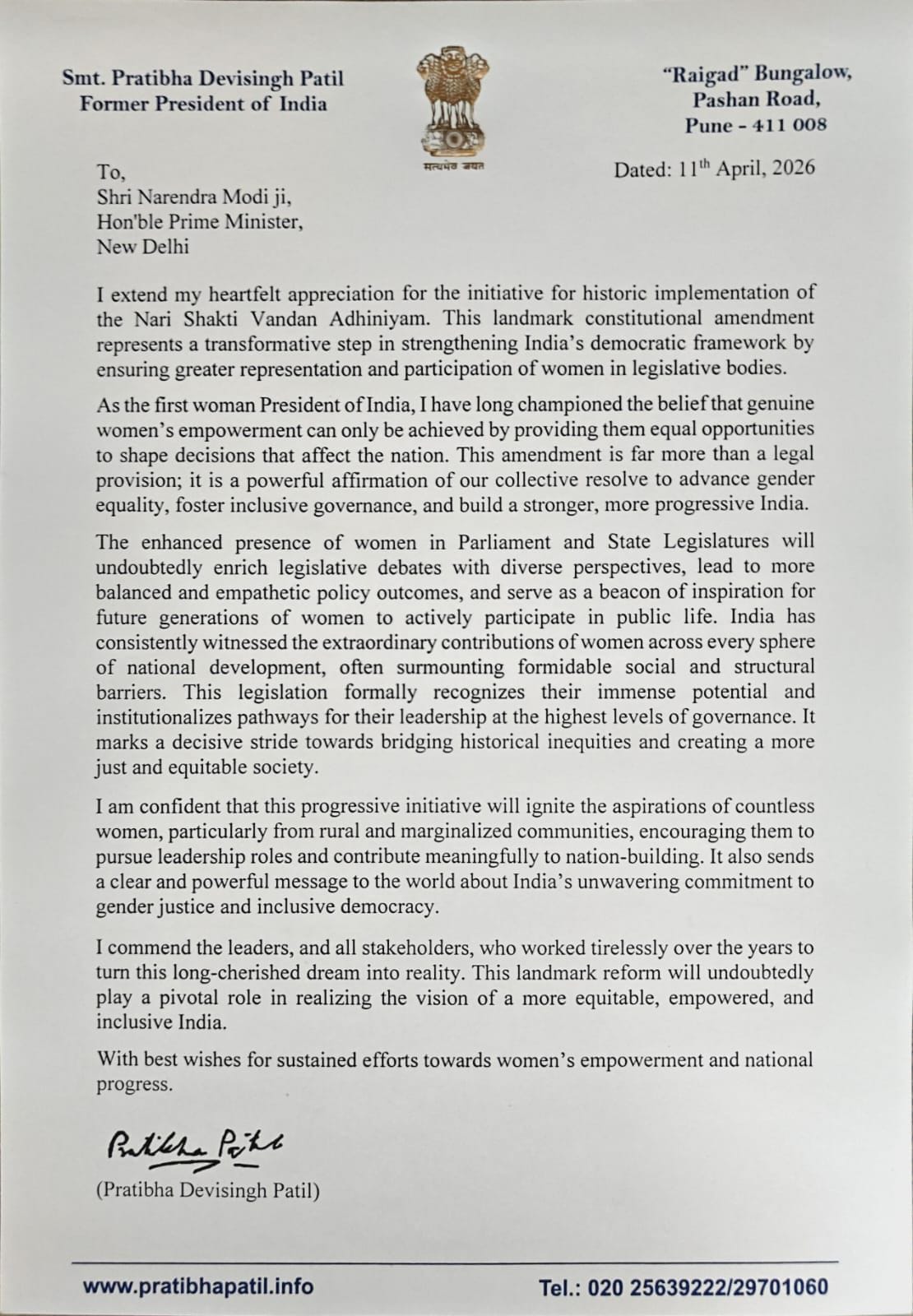 भारत की पूर्व राष्ट्रपति प्रतिभा पाटिल ने प्रधानमंत्री नरेंद्र मोदी को एक पत्र लिखकर महिला आरक्षण बिल को लेकर सरकार की पहल की सराहना की है। अपने पत्र में पूर्व राष्ट्रपति ने इस बिल को एक ऐतिहासिक और सकारात्मक कदम बताया। उन्होंने इस बात पर जोर दिया कि संसद और विधानसभाओं में महिलाओं की भागीदारी बढ़ने से कानून बनाने की प्रक्रिया और मजबूत होगी, नीतियां ज्यादा संतुलित और संवेदनशील होंगी और आने वाली पीढ़ियों की महिलाओं को प्रेरणा मिलेगी।