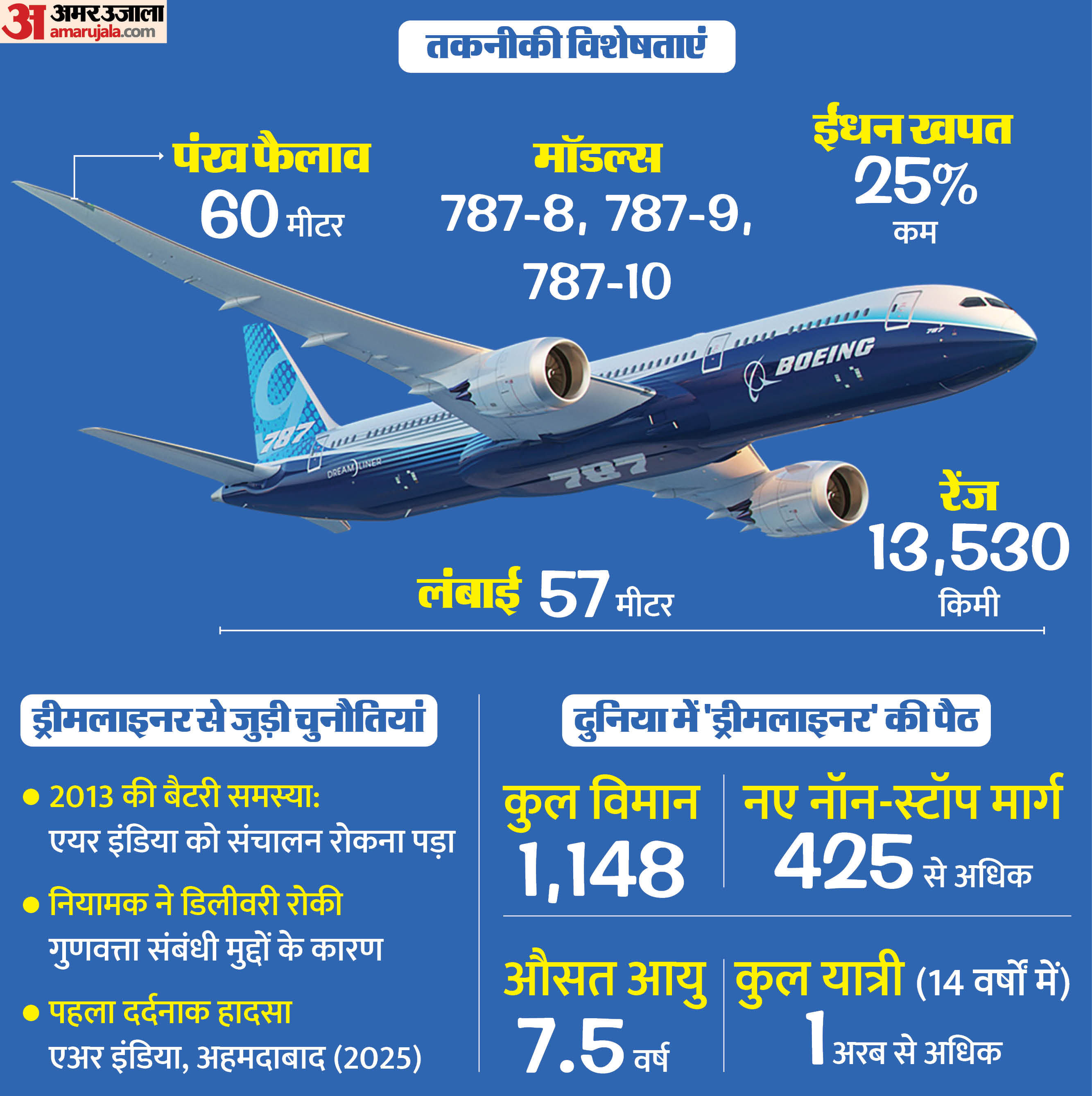 एअर इंडिया का दुर्घटना में शामिल विमान AI171 एक बोइंग 787-8 ड्रीमलाइनर था। इसका पंजीकरण संख्या VT-ANB और सीरियल नंबर 36279 था। विमान ने पहली बार 14 दिसंबर 2013 को उड़ान भरी थी। इसे बोइंग की ओर से जनवरी 2014 में एयर इंडिया को सौंपा गया था। फ्लाइट एआई 171, बोइंग 787-8 ड्रीमलाइनर, एक वाइडबॉडी, दो इंजन वाला विमान है। एविएशन सेफ्टी नेटवर्क डेटाबेस के अनुसार, यह बोइंग 787 विमान की पहली दुर्घटना थी।