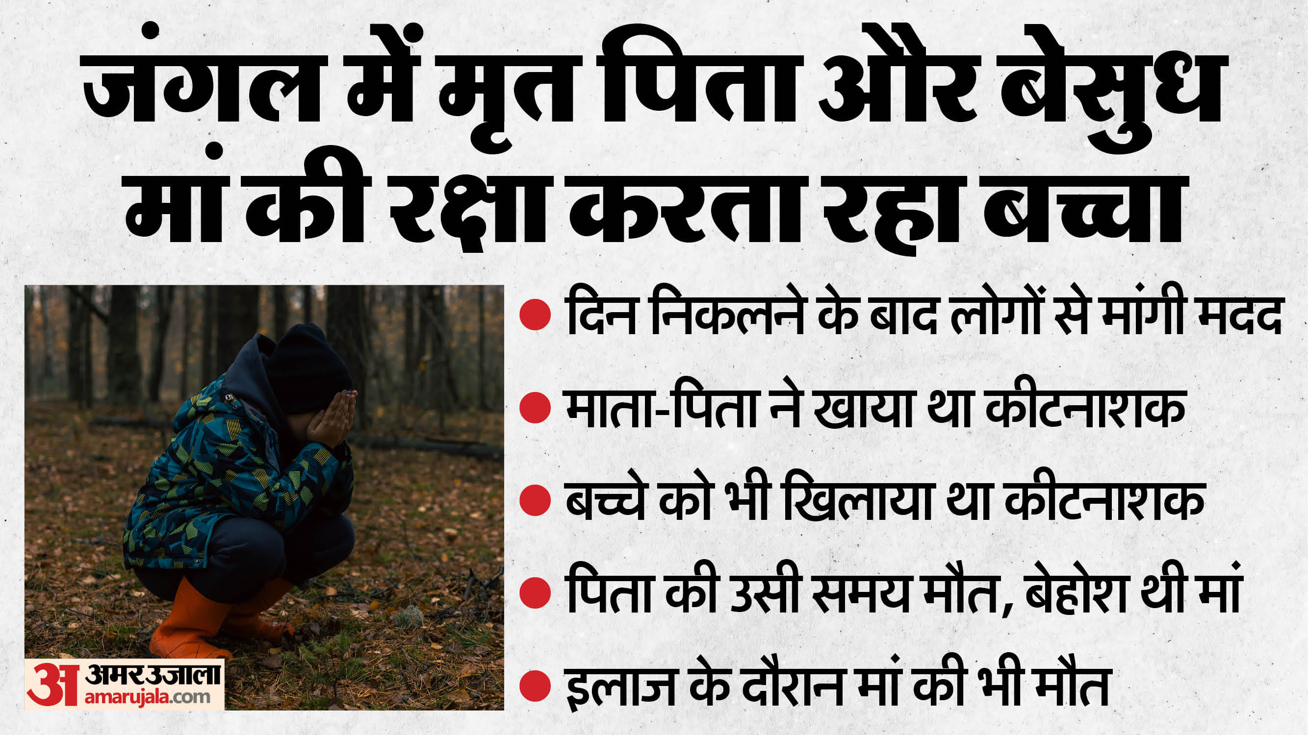 ओडिशा के देवगढ़ में पांच साल का बच्चा पूरी रात जंगल में अपने मृत पिता और बेसुध मां की देखभाल करता रहा। माता-पिता घरेलू विवाद के चलते कीटनाशक का सेवन कर बैठे थे। सूरज निकलने पर बच्चा सड़क पर जाकर राहगीरों से मदद मांग सका। हालांकि इलाज के दौरान मां भी चल बसी।