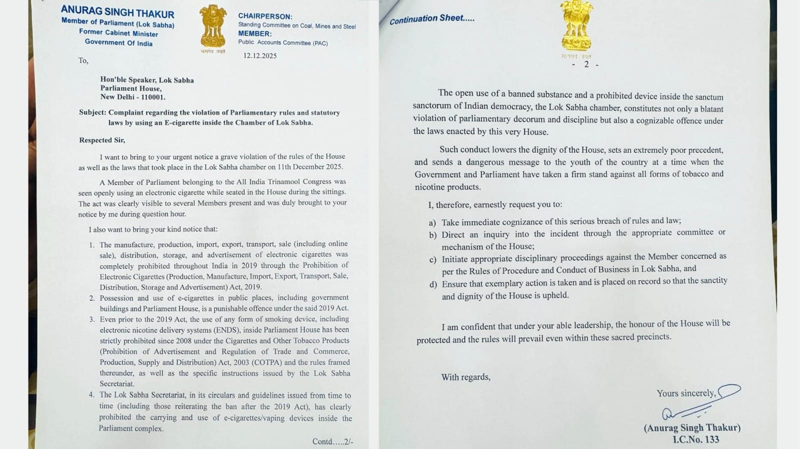 संसद में ई-सिगरेट विवाद: भाजपा सांसद अनुराग ठाकुर ने TMC सांसद के खिलाफ शिकायत की, लोकसभा स्पीकर को लिखा पत्र