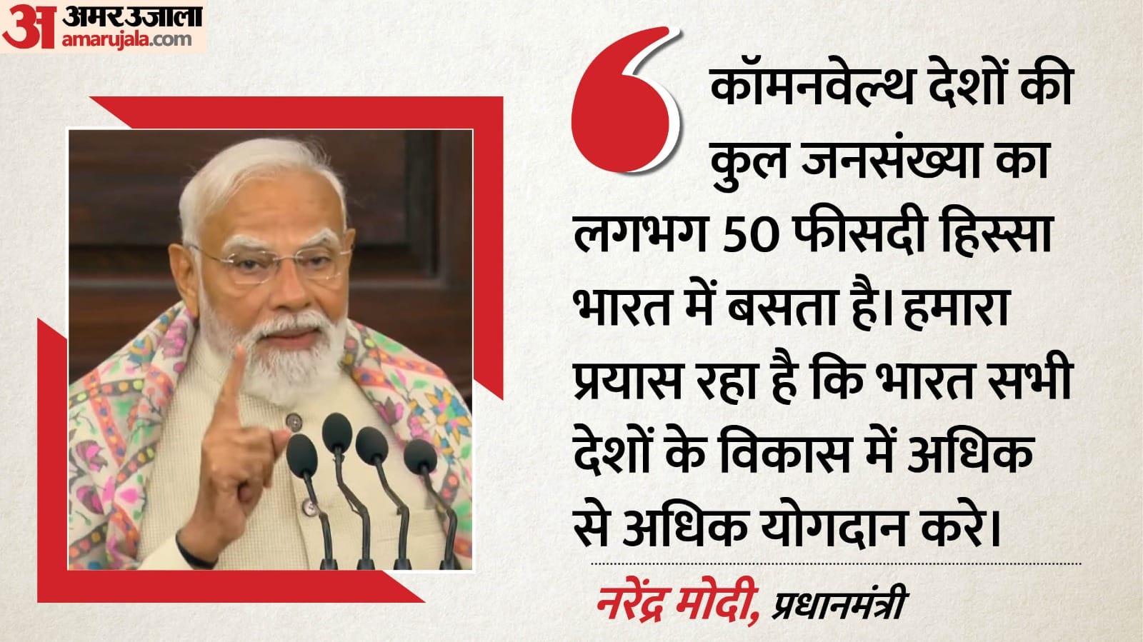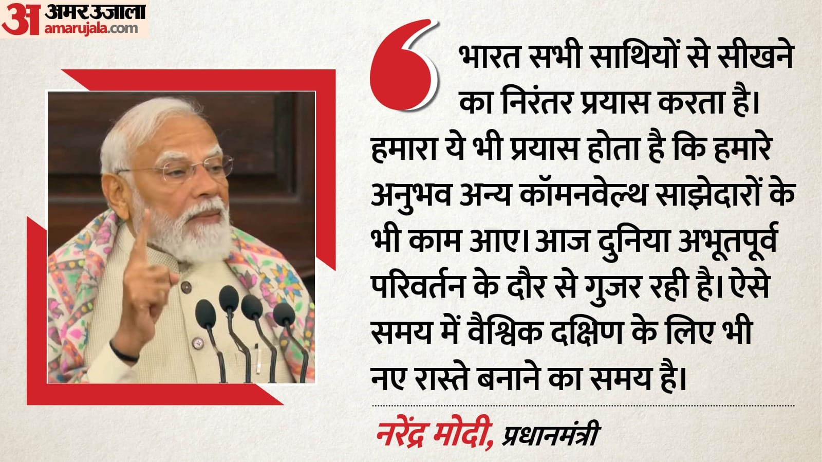 कॉमनवेल्थ देशों की कुल जनसंख्या का लगभग 50 फीसदी हिस्सा भारत में बसता है। हमारा प्रयास रहा है कि भारत सभी देशों के विकास में अधिक से अधिक योगदान करे। कॉमनवेल्थ के सतत विकास लक्ष्यों में स्वास्थ्य, जलवायु परिवर्तन और आर्थिक विकास और नवाचार के क्षेत्र में हम पूरी जिम्मेदारी के साथ अपनी प्रतिबद्धता को पूरा कर रहे हैं। भारत सभी साथियों से सीखने का निरंतर प्रयास करता है। हमारा ये भी प्रयास होता है कि हमारे अनुभव अन्य कॉमनवेल्थ साझेदारों के भी काम आए। आज दुनिया अभूतपूर्व परिवर्तन के दौर से गुजर रही है। ऐसे समय में वैश्विक दक्षिण के लिए भी नए रास्ते बनाने का समय है।