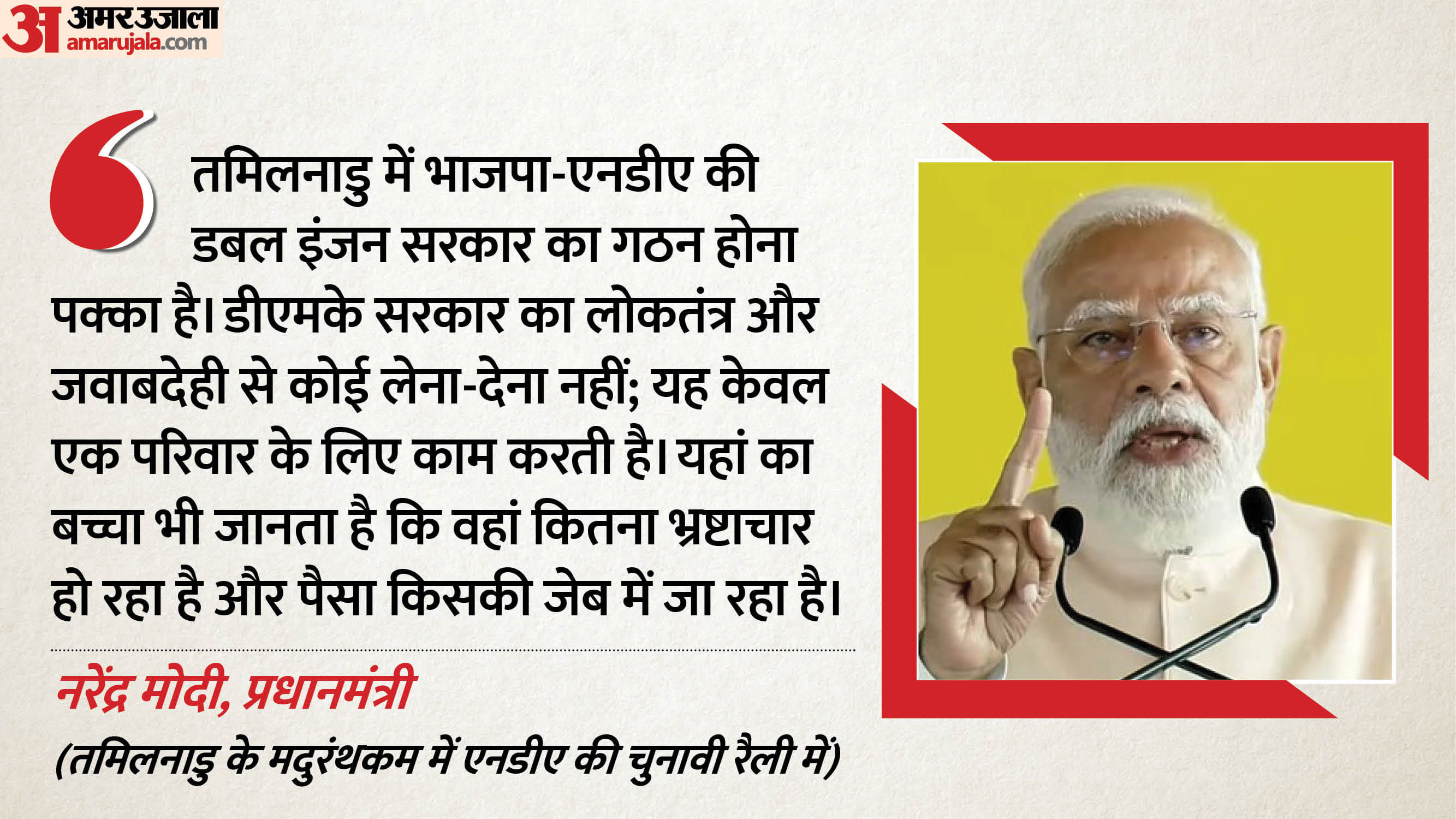 इस दौरान पीएम मोदी ने कहा कि तमिलनाडु में भाजपा-एनडीए की डबल इंजन सरकार का गठन होना पक्का है। डीएमके सरकार का लोकतंत्र और जवाबदेही से कोई लेना-देना नहीं; यह केवल एक परिवार के लिए काम करती है। यहां का बच्चा भी जानता है कि वहां कितना भ्रष्टाचार हो रहा है और पैसा किसकी जेब में जा रहा है।
