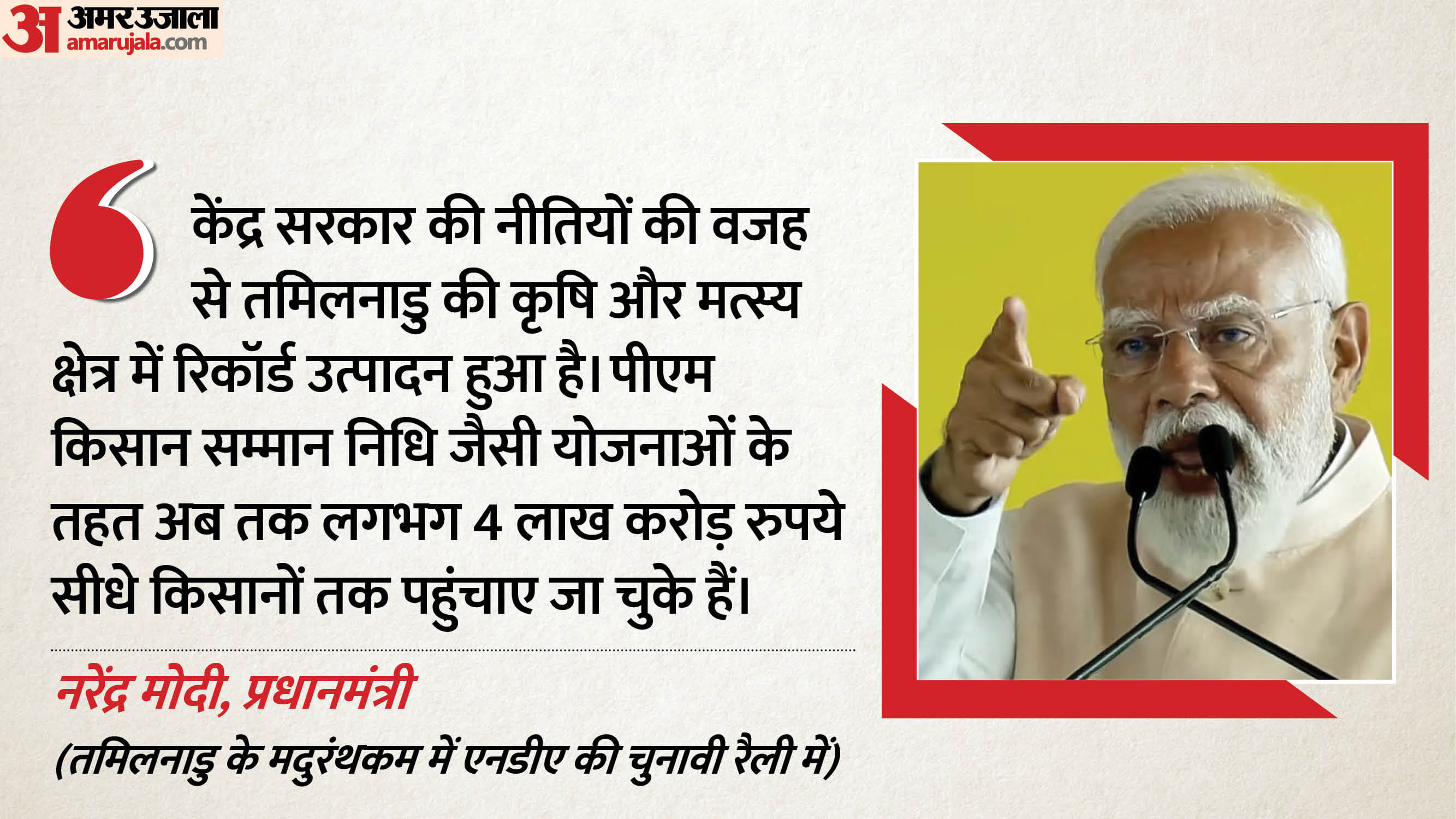 प्रधानमंत्री नरेंद्र मोदी ने तमिलनाडु की जनता को विकास और किसान-किस्मत सुधार की दिशा में किए गए कामों की जानकारी दी। उन्होंने कहा कि तमिलनाडु की सबसे बड़ी ताकत इसके किसान और मछुआरे हैं, और NDA केंद्र सरकार की नीतियों की वजह से कृषि और मत्स्य क्षेत्र में रिकॉर्ड उत्पादन हुआ है। मोदी ने बताया कि किसानों के लिए बैंक खाते खोलने, पीएम किसान सम्मान निधि जैसी योजनाओं के तहत अब तक लगभग 4 लाख करोड़ रुपये सीधे किसानों तक पहुंचाए जा चुके हैं।