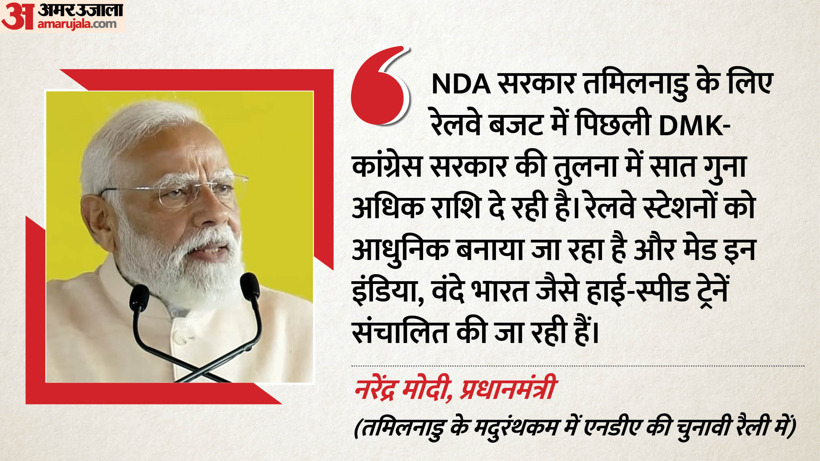 प्रधानमंत्री ने रेलवे के क्षेत्र में भी किए गए कामों का हवाला दिया। उन्होंने कहा कि एनडीए सरकार तमिलनाडु के लिए रेलवे बजट में पिछली डीएमके-कांग्रेस सरकार की तुलना में सात गुना अधिक राशि दे रही है। रेलवे स्टेशनों को आधुनिक बनाया जा रहा है और मेड इन इंडिया, वंदे भारत जैसे हाई-स्पीड ट्रेनें संचालित की जा रही हैं।