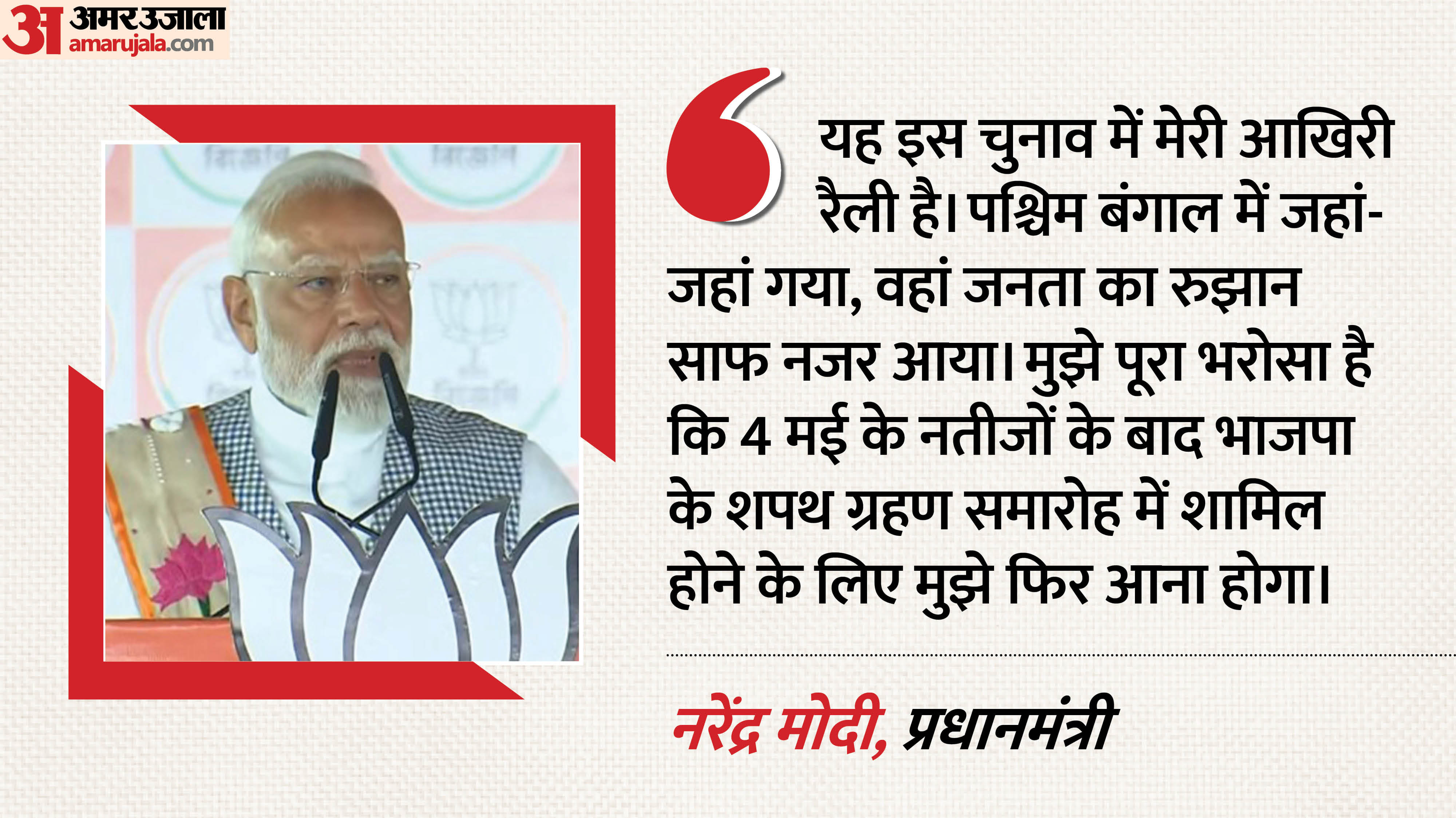 रैली को चुनाव प्रचार की अंतिम सभा बताते हुए पीएम मोदी ने कहा कि पूरे राज्य में लोगों का मूड देखकर उन्हें विश्वास है कि 4 मई को नतीजे आने के बाद भाजपा की सरकार बनेगी और वह शपथ ग्रहण समारोह में शामिल होने फिर बंगाल आएंगे।
