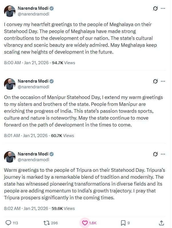 PM Modi Wish on Statehood: आज पूर्वोत्तर के तीन राज्यों का स्थापना दिवस, पीएम मोदी ने राज्यवासियों को दी बधाई। उन्होंने कहा कि मणिपुर के लोग अपने समर्पण और कड़ी मेहनत के माध्यम से भारत की प्रगति को समृद्ध कर रहे हैं। इसके साथ ही विश्वास व्यक्त किया कि राज्य आने वाले समय में विकास के पथ पर लगातार आगे बढ़ता रहेगा। उन्होंने कहा कि राज्य का खेलों के प्रति जुनून, समृद्ध सांस्कृतिक विरासत और प्रकृति के साथ घनिष्ठ संबंध वास्तव में उल्लेखनीय हैं।