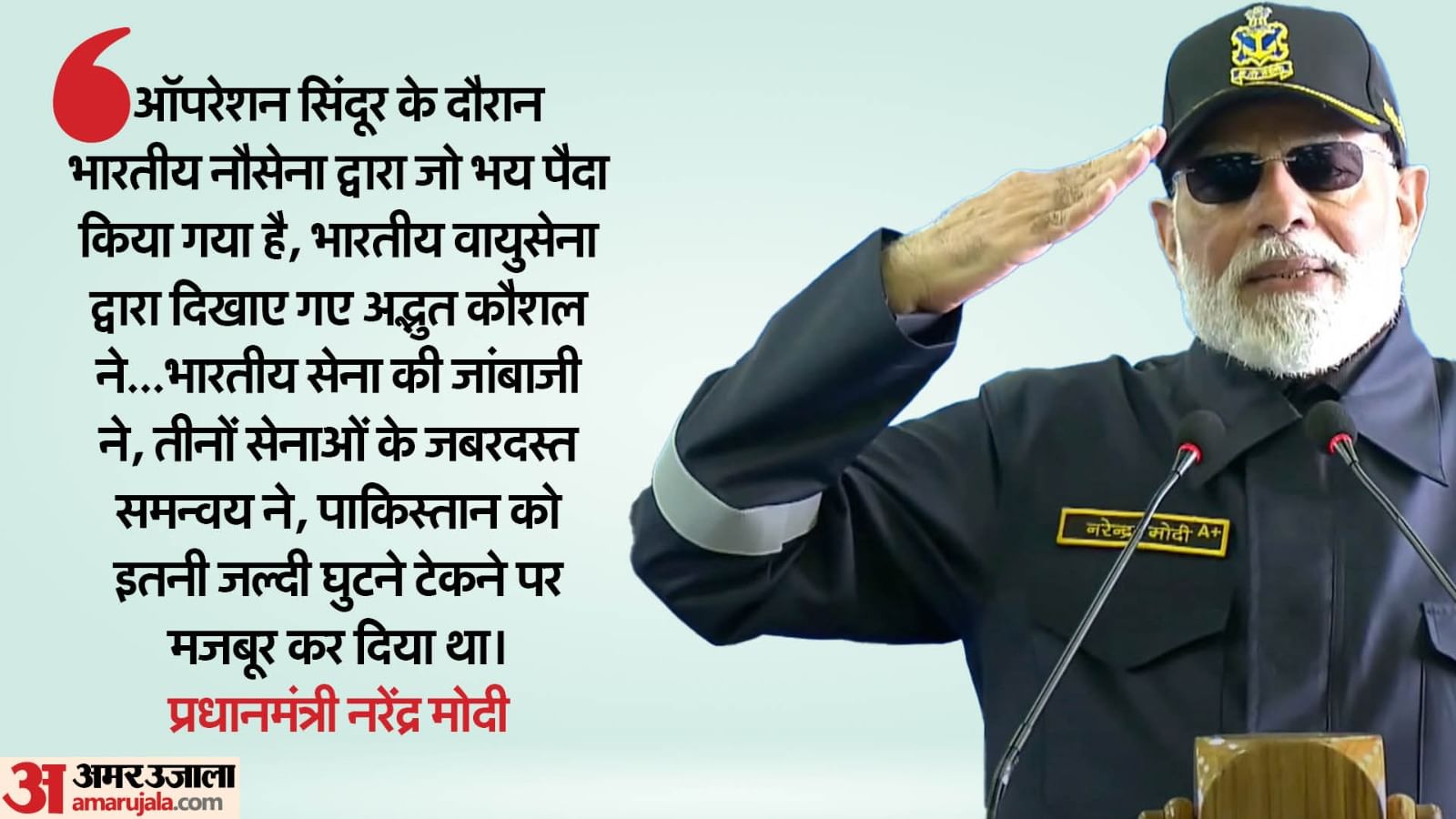 पीएम मोदी ने कहा, कुछ महीने पहले ही हमने देखा कि कैसे विक्रांत नाम ने ही पूरे पाकिस्तान में खौफ की लहर दौड़ा दी थी। इसकी ताकत ऐसी है... एक ऐसा नाम जो युद्ध शुरू होने से पहले ही दुश्मन के हौसले पस्त कर देता है। यही है आईएनएस विक्रांत की ताकत... इस अवसर पर, मैं विशेष रूप से हमारे सशस्त्र बलों को सलाम करना चाहता हूं। भारतीय नौसेना द्वारा जो भय पैदा किया गया है, भारतीय वायुसेना द्वारा दिखाए गए अद्भुत कौशल ने, भारतीय सेना की जांबाजी ने, तीनों सेनाओं के जबरदस्त समन्वय ने, ऑपरेशन सिंदूर में पाकिस्तान को इतनी जल्दी घुटने टेकने पर मजबूर कर दिया था और इसलिए आज मैं फिर एक बार आईएनएस विक्रांत की इस पवित्र साधना स्थली से, पराक्रमी स्थली से, तीनों सेना के जांबाज जवानों को सलाम करता हूं।