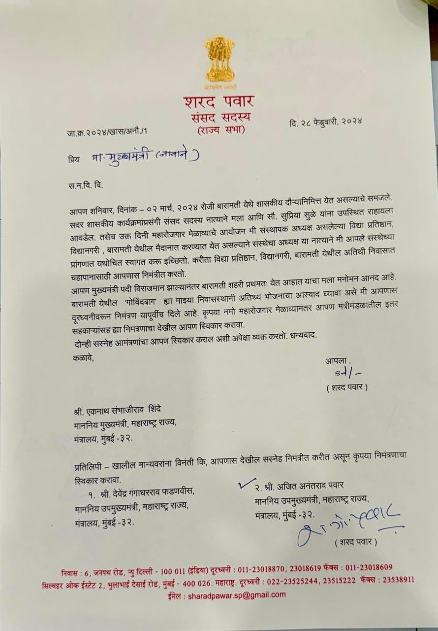 शिंदे को लिखे पत्र में राज्यसभा सांसद ने कहा कि विद्या प्रतिष्ठान के अध्यक्ष के रूप में उन्हें शैक्षणिक संस्थान के परिसर में मुख्यमंत्री का स्वागत करने में खुशी होगी। शरद पवार ने शिंदे से फडणवीस और अजित पवार के साथ विद्या प्रतिष्ठान में कार्यक्रम के बाद बारामती में उनके आवास 'गोविंदबाग' पर भोजन के लिए उनके निमंत्रण को स्वीकार करने का आग्रह किया है।