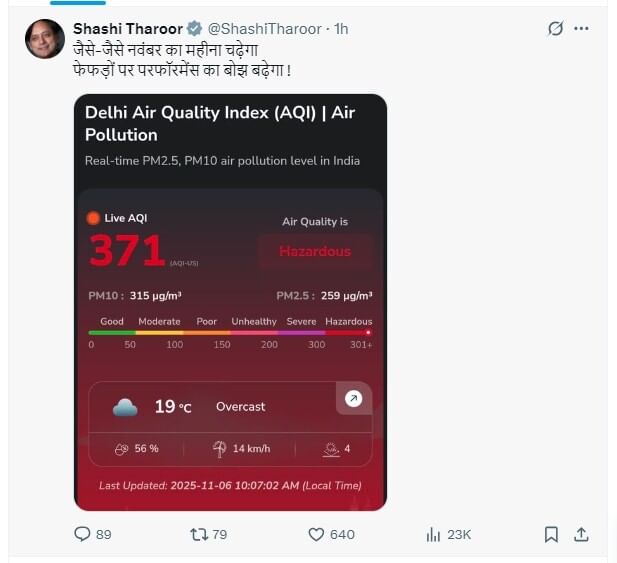 Shashi Tharoor on Delhi AQI pressure of performance on lungs congress MP comment on toxic air quality hindi