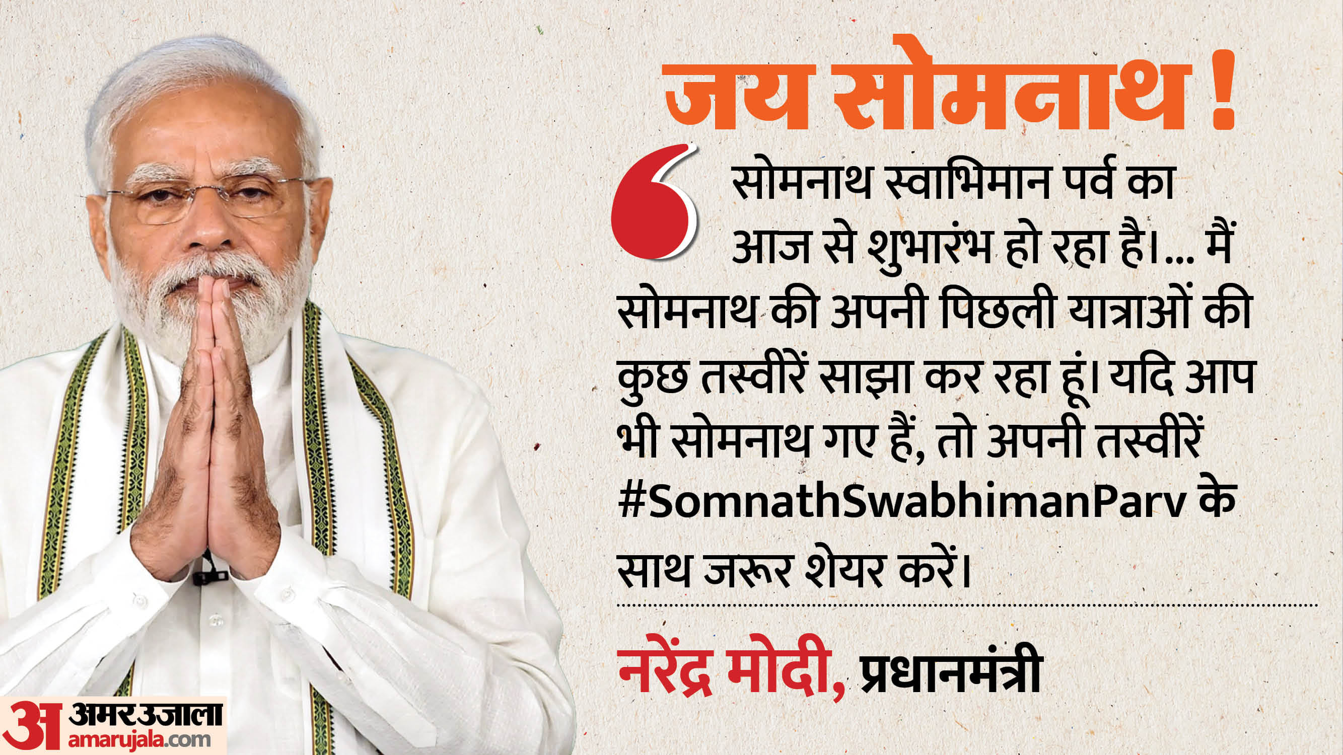 मोदी ने कहा कि वर्ष 2026 में 1951 के भव्य समारोह के 75 वर्ष पूर्ण होने का स्मरण भी किया जा रहा है। उन्होंने 'जय सोमनाथ' के उद्घोष के साथ बताया कि आज से सोमनाथ स्वाभिमान पर्व का शुभारंभ हो रहा है। इस अवसर पर उन्होंने सोमनाथ की अपनी पिछली यात्राओं की तस्वीरें साझा करते हुए लोगों से आग्रह किया कि यदि वे भी सोमनाथ गए हैं, तो अपनी तस्वीरें #SomnathSwabhimanParv के साथ साझा करें।