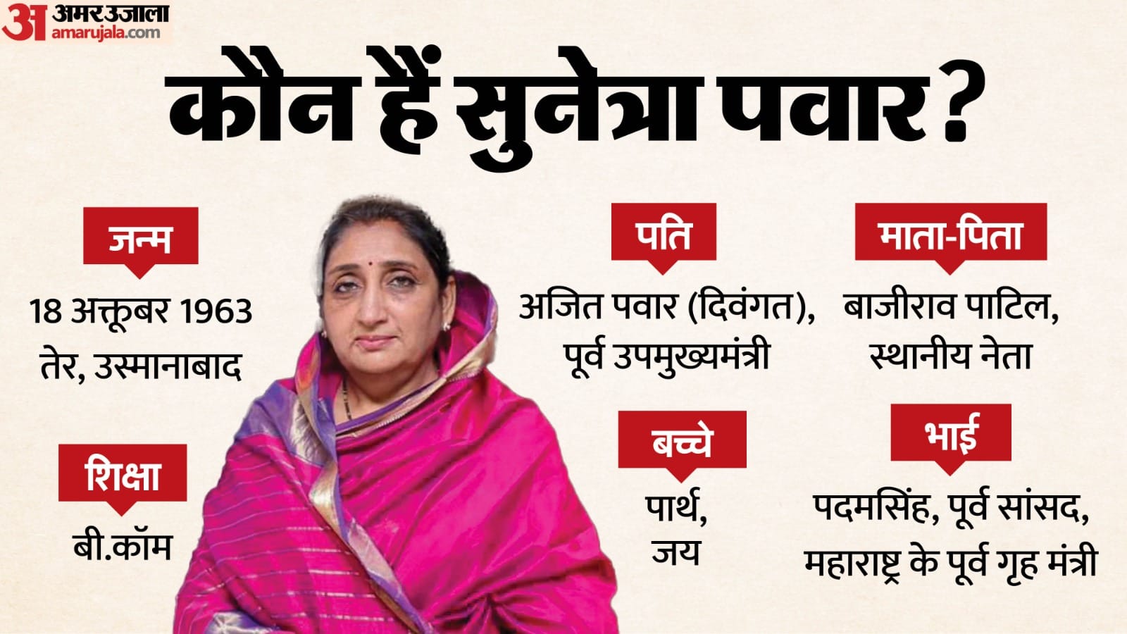 सुनेत्रा पवार कौन हैं? बारामती के 'दादा' अजित पवार से इतर उनकी अपनी क्या पहचान रही है? उनका पारिवारिक इतिहास क्या रहा है? अजित पवार से उनकी शादी कैसे हुई? सुनेत्रा की राजनीति में कब एंट्री हुई? आइये जानते हैं...