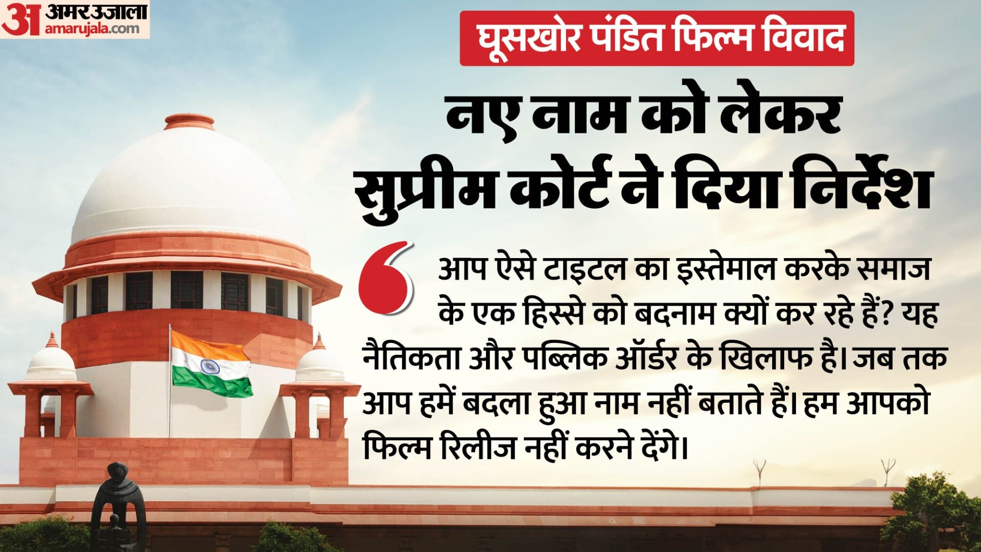 पीटीआई की खबर के अनुसार जस्टिस बीवी नागरत्ना और उज्जल भुयान की बेंच ने फिल्म ‘घूसखाेर पंडित’ की एक याचिका पर सूचना और प्रसारण मंत्रालय, सेंट्रल बोर्ड फॉर फिल्म सर्टिफिकेशन को भी नोटिस जारी किया है। कोर्ट ने कहा, ‘आप ऐसे टाइटल का इस्तेमाल करके समाज के एक हिस्से को बदनाम क्यों कर रहे हैं? यह नैतिकता और पब्लिक ऑर्डर के खिलाफ है। जब तक आप हमें बदला हुआ नाम नहीं बताते हैं। हम आपको फिल्म रिलीज नहीं करने देंगे।’