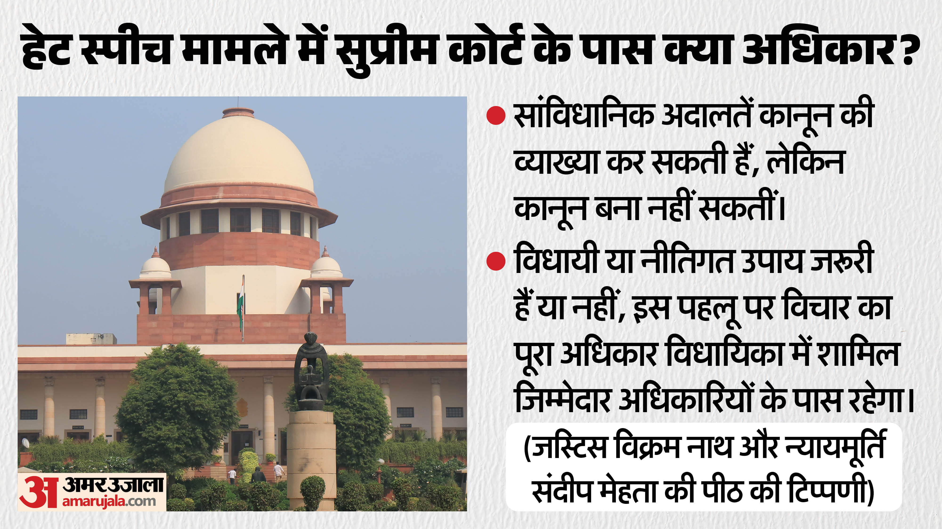 सुप्रीम कोर्ट ने हेट स्पीच मामलों पर सुनवाई करते हुए कहा कि मौजूदा कानून पर्याप्त हैं और किसी तरह का विधायी खालीपन नहीं है। अदालत ने स्पष्ट किया कि न्यायपालिका नए अपराध नहीं बना सकती और न ही कानून बनाने के लिए बाध्य कर सकती है।