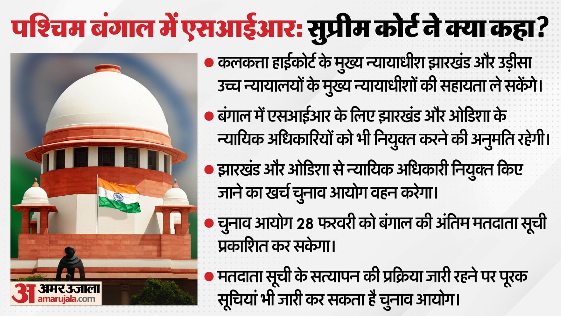 सुप्रीम कोर्ट ने स्पष्ट किया कि कलकत्ता हाईकोर्ट के मुख्य न्यायाधीश तीन साल से अधिक अनुभव वाले सिविल जज, चाहे वे सीनियर डिवीजन के हों या जूनियर डिवीजन के, एसआईआर प्रक्रिया में लगा सकते हैं। यदि इसके बाद भी मानव संसाधन की कमी हो तो झारखंड और उड़ीसा हाईकोर्ट से सेवारत या सेवानिवृत्त न्यायिक अधिकारियों की मदद ली जा सकती है। अदालत ने दोनों राज्यों के मुख्य न्यायाधीशों से ऐसे अनुरोध पर सहानुभूतिपूर्वक विचार करने को कहा है।
