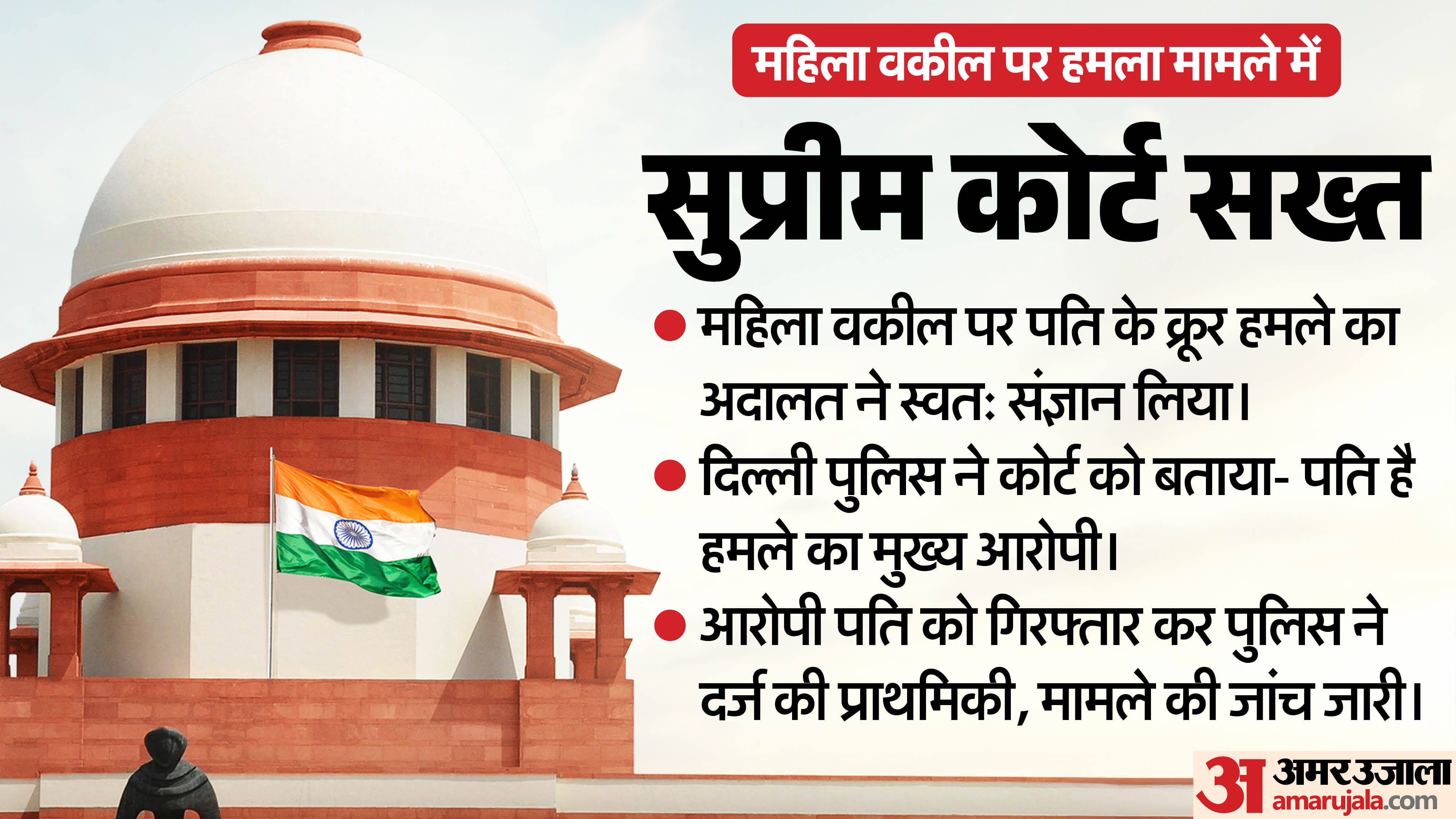 सुप्रीम कोर्ट ने दिल्ली में महिला वकील से कथित बर्बर मारपीट मामले का संज्ञान लेते हुए दिल्ली पुलिस को जांच वरिष्ठ अधिकारी, महिला एसीपी या डीसीपी, को सौंपने का आदेश दिया। साथ ही अदालत ने तीन अस्पतालों द्वारा पीड़िता को भर्ती करने से इनकार के पहलू की भी जांच के निर्देश दिए हैं।