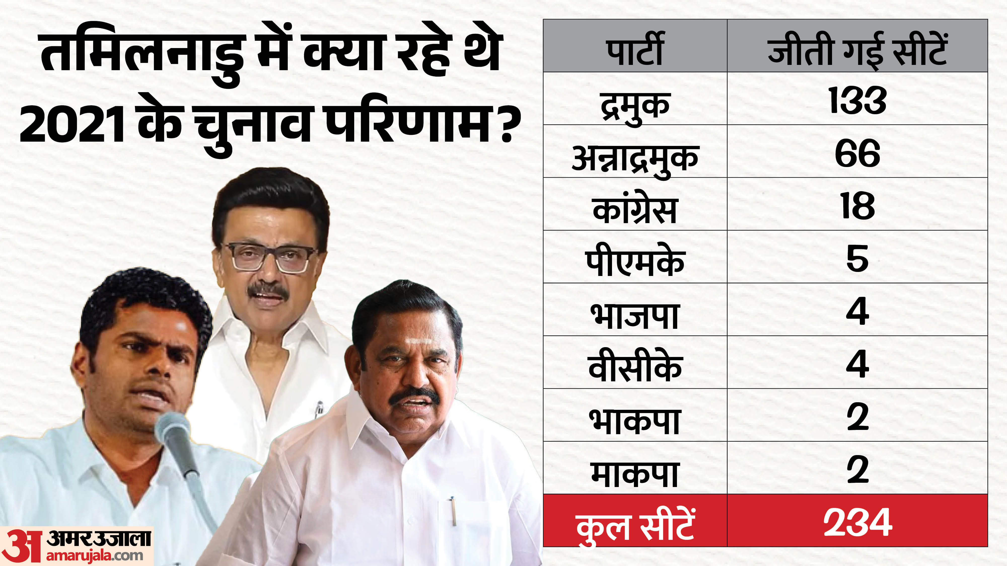 चुनाव नतीजों को देखा जाए तो सामने आता है कि द्रमुक ने 234 सीट वाली विधानसभा में अकेले 133 सीटें जीतकर पिछले 25 वर्षों में पहली बार अपने दम पर पूर्ण बहुमत (118 का जादुई आंकड़ा) हासिल किया। द्रमुक के नेतृत्व वाले गठबंधन को कुल मिलाकर 45.38% वोट मिले, जिसमें अकेले द्रमुक का वोट शेयर 37.70% रहा, जबकि एनडीए गठबंधन 39.71% वोट मिले, जिसमें एआईएडीएमके का हिस्सा 33.29% रहा।