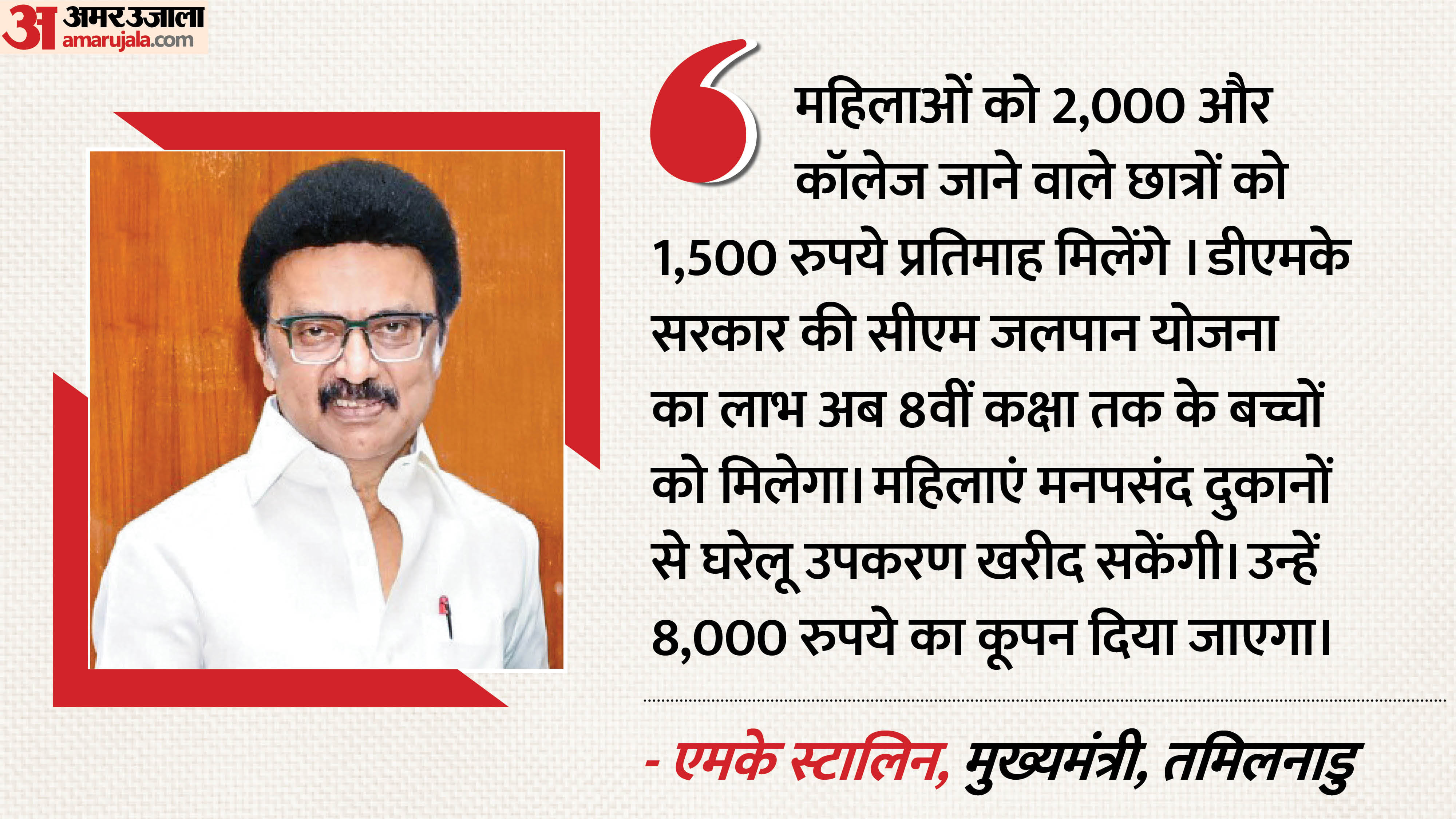 स्टालिन ने सत्ता में वापसी पर कई कल्याणकारी योजनाओं की घोषणा की। महिलाओं को घरेलू उपकरण खरीदने के लिए आठ हजार रुपये का कूपन मिलेगा। महिलाओं के लिए मासिक सहायता राशि को बढ़ाकर दो हजार रुपये प्रति माह किया जाएगा। उच्च शिक्षा प्राप्त करने वाले छात्रों को अब पंद्रह सौ रुपये प्रति माह की सहायता मिलेगी, जो पहले एक हजार रुपये थी।