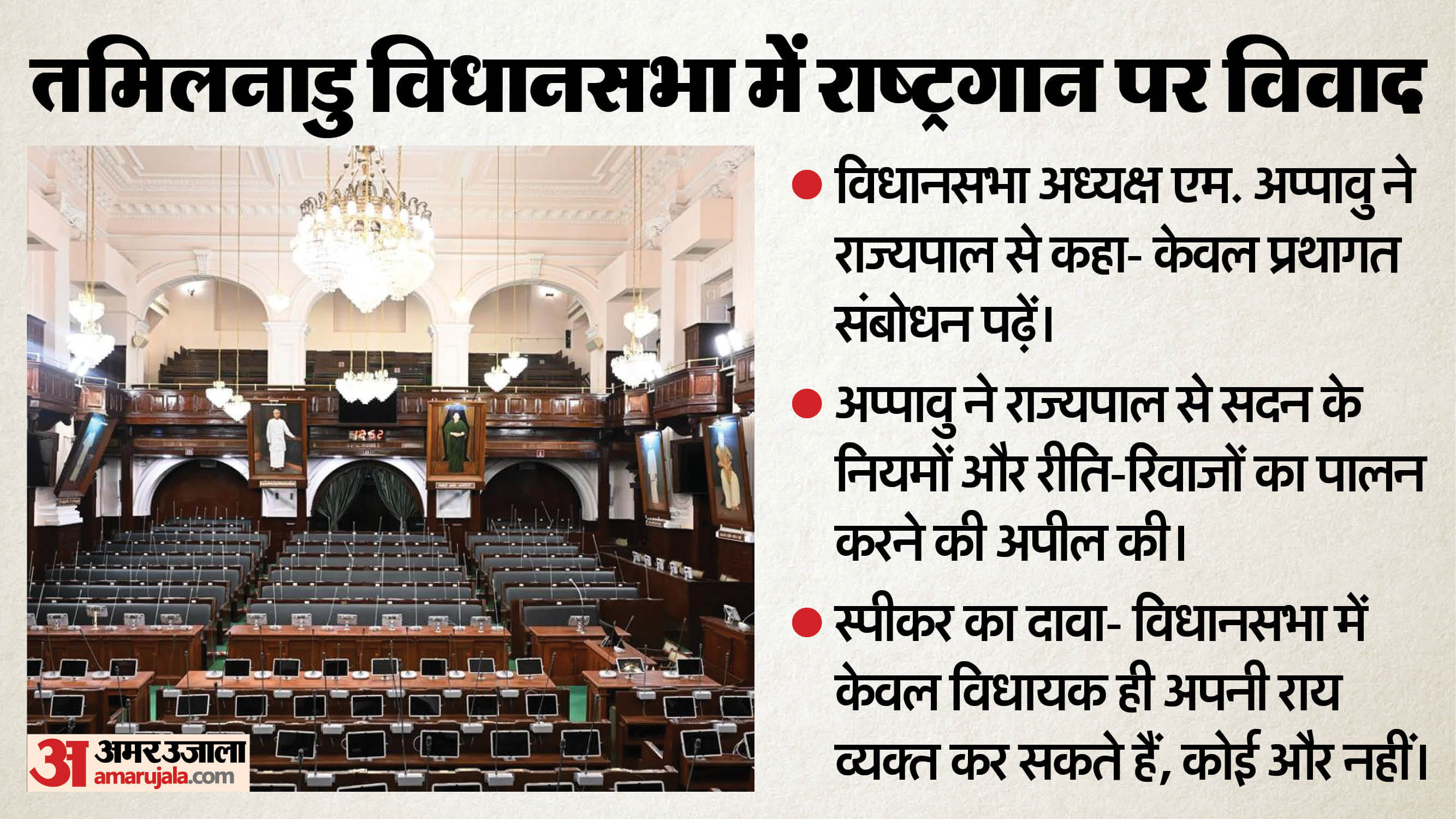 तमिलनाडु के राज्यपाल आरएन रवि ने विधानसभा का उद्घाटन भाषण नहीं दिया और कक्ष छोड़ दिया। उन्होंने राष्ट्रगान के अपमान, भाषण में असत्य और संवैधानिक कर्तव्यों की अनदेखी का आरोप लगाया। जबकि सीएम स्टालिन ने कहा यह परंपरा और शिष्टाचार का उल्लंघन है।