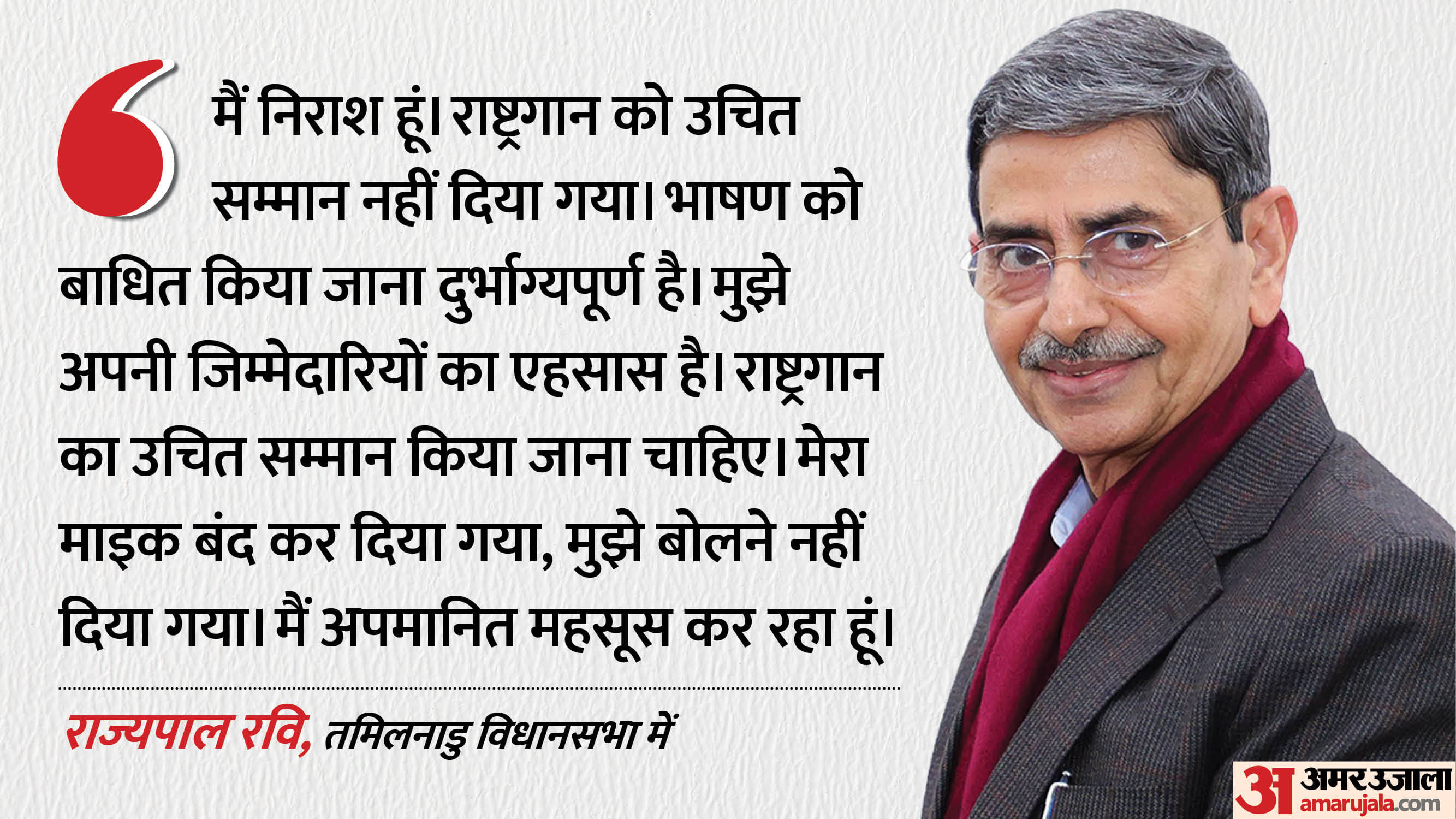 तमिलनाडु के राज्यपाल आरएन रवी ने मंगलवार को विधानसभा का साल का पहला सत्र शुरू होने से पहले परंपरागत उद्घाटन भाषण नहीं दिया और गुस्से में कक्ष छोड़ दिया। इसका कारण राष्ट्रीय गान के प्रति सम्मान की कमी बताया। राज्यपाल ने कहा कि डीएमके सरकार द्वारा तैयार किए गए भाषण में कुछ असत्य और गलत तथ्य थे। उनके माइक को बार-बार बंद किया गया और उन्हें बोलने की अनुमति नहीं दी गई।