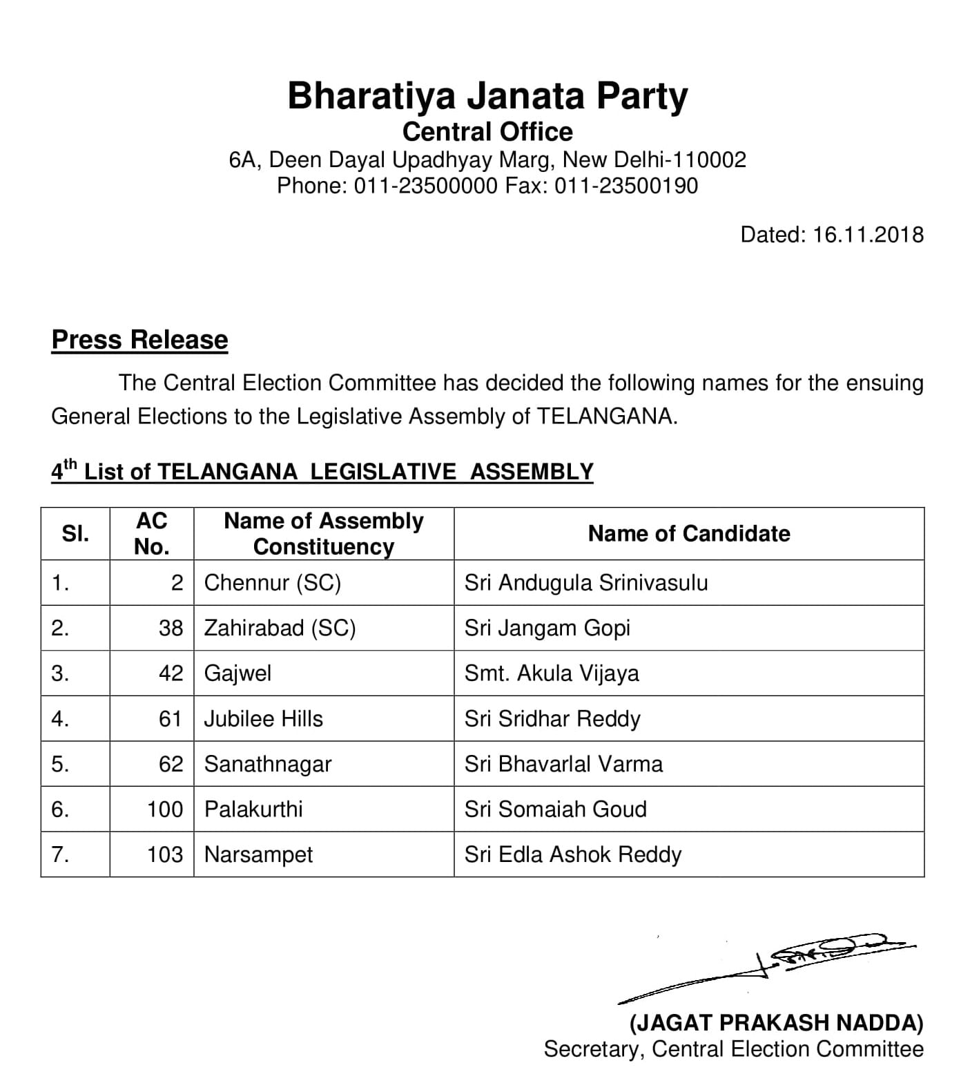 तेलंगाना विधानसभा चुनाव : भाजपा ने जारी की सात प्रत्याशियों की चौथी सूची