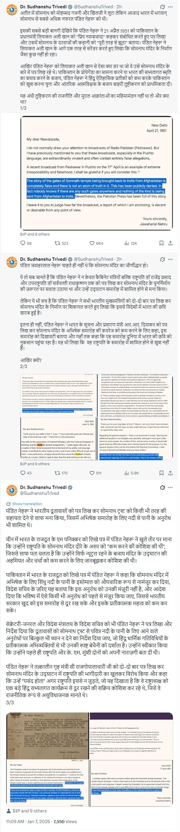 सोशल मीडिया प्लेटफॉर्म 'एक्स' पर एक पोस्ट साझा करते हुए त्रिवेदी ने नेहरू द्वारा कथित तौर पर पाकिस्तान के तत्कालीन प्रधानमंत्री लियाकत अली खान को लिखे गए एक पत्र को साझा किया। त्रिवेदी ने दावा किया कि, इस पत्र में नेहरू ने खान को 'प्रिय नवाबजादा' कहकर संबोधित किया और सोमनाथ के दरवाजों की कथा को पूरी तरह झूठा बताया।