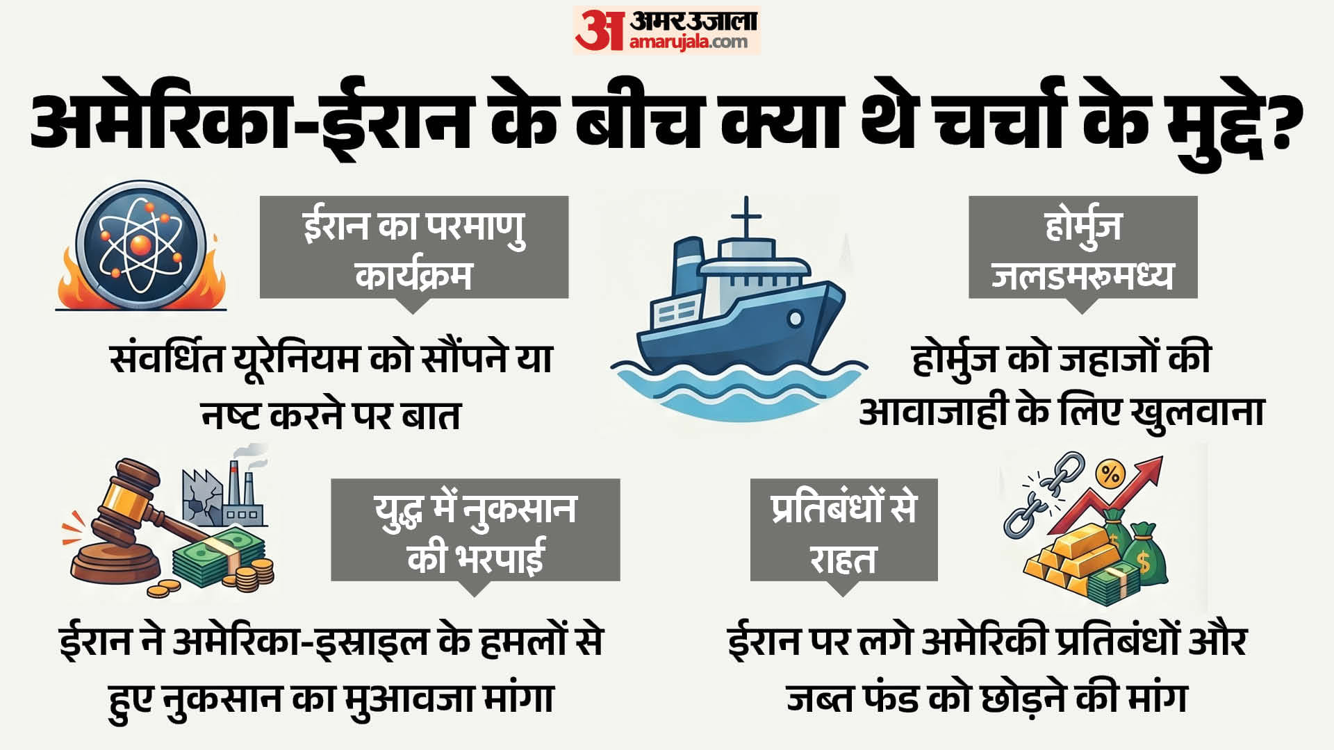 युद्ध में हुए नुकसान की भरपाई: बातचीत के दौरान ईरान ने हालिया अमेरिकी और इस्राइली हमलों की वजह से हुए नुकसान के लिए मुआवजे की मांग रखी।